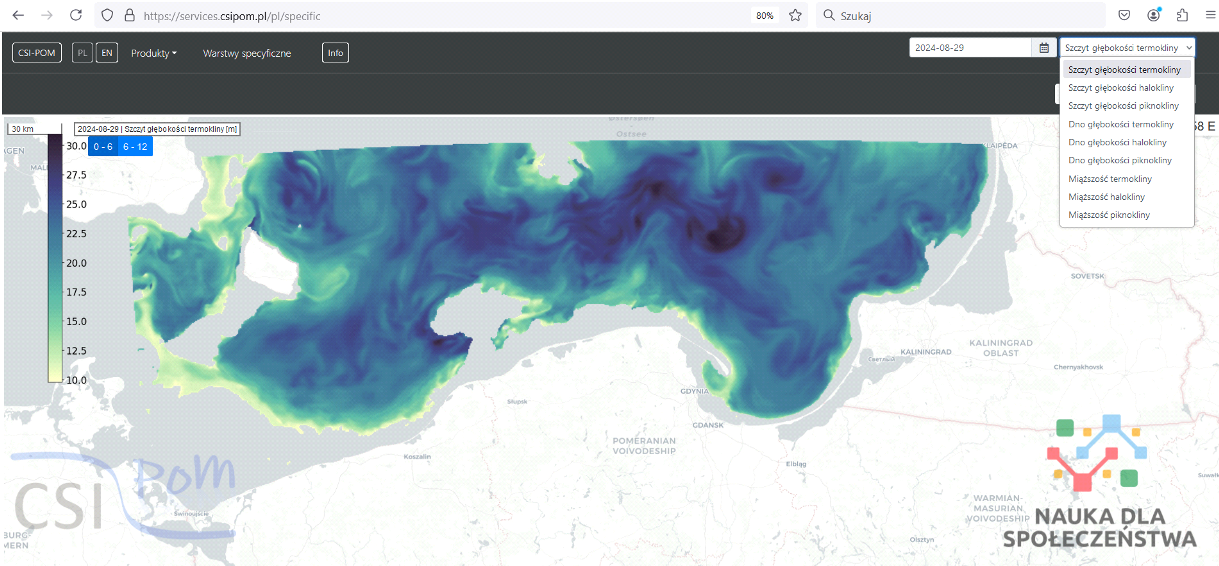 Rysunek 6. Widok okna strony CSI-POM po wybraniu produktu „Warstwy specyficzne”, parametru „Szczyt głębokości termokliny” i daty.