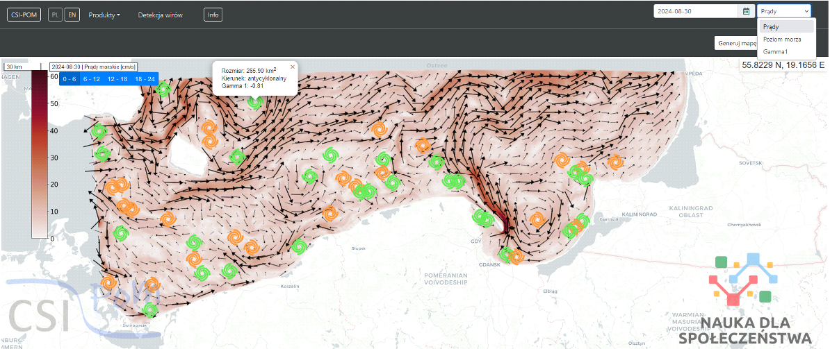 Obecnie w Europie modelowaniem parametrów hydrodynamicznych Morza Bałtyckiego zajmuje się kilka instytucji naukowych w Szwecji, Danii, Finlandii i Polsce (istniejące modele HIROMB, RCO, NEMO, SCOBI, DMI/ERGOM, HIRLAM, BALTSEM, CEMBS, M3D i inne). Wszystkie modele wyznaczają tylko podstawowe parametry hydrodynamiczne środowiska morskiego. Żaden z nich nie prowadzi jednak w sposób kompleksowy, w trybie operacyjnym, jednoczesnego prognozowania podstawowych parametrów hydrodynamicznych, jak i narzędzi proponowanych projekcie CSI-POM (Digital Information System on the environment of Polish maritime areas) określających czasowo-przestrzenną silnie uwarstwioną strukturę badanego obszaru. W artykule Dzierzbicka-Głowacka i inni (2024) szczegółowo przestawiono działanie systemu CSI-POM Digital Information System on the environment of Polish maritime areas – Etap 1, który umożliwia śledzenie warunków hydrodynamicznych, co znacznie ułatwi prognozowanie zagrożeń (jak detekcja wirów morskich, wykrywanie prądu wznoszącego) i działań gospodarczych (jak morska energetyka odnawialna, aktywność transportowo-logistyczna) w polskich obszarach morskich.