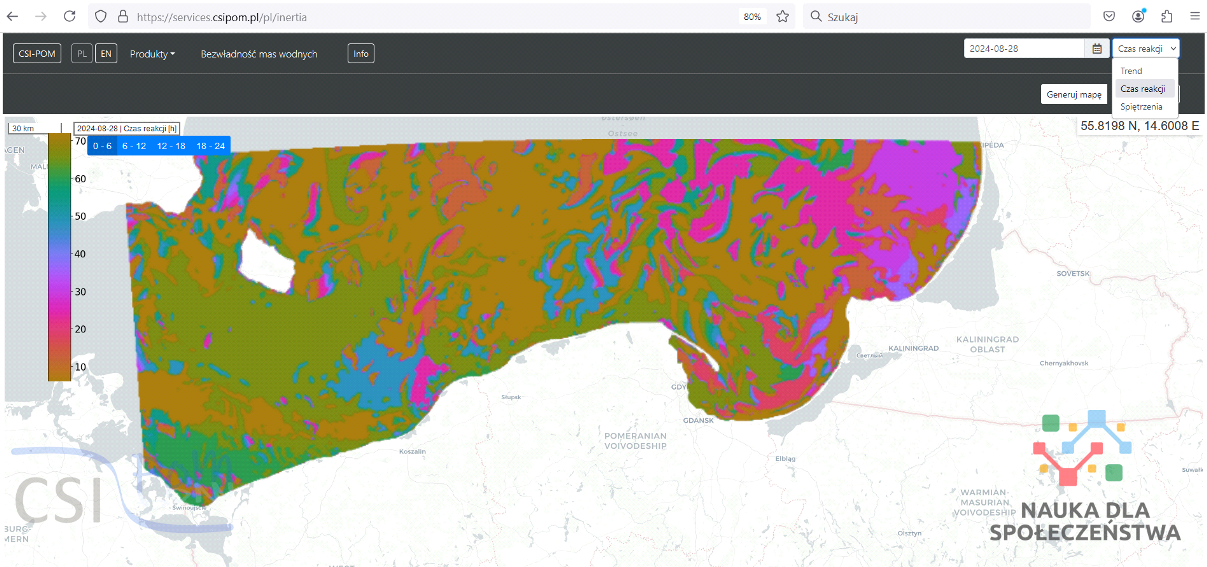 Rysunek 8. Widok okna strony CSI-POM po wybraniu produktu „Bezwładność mas wodnych”, parametru „czas reakcji” i daty.