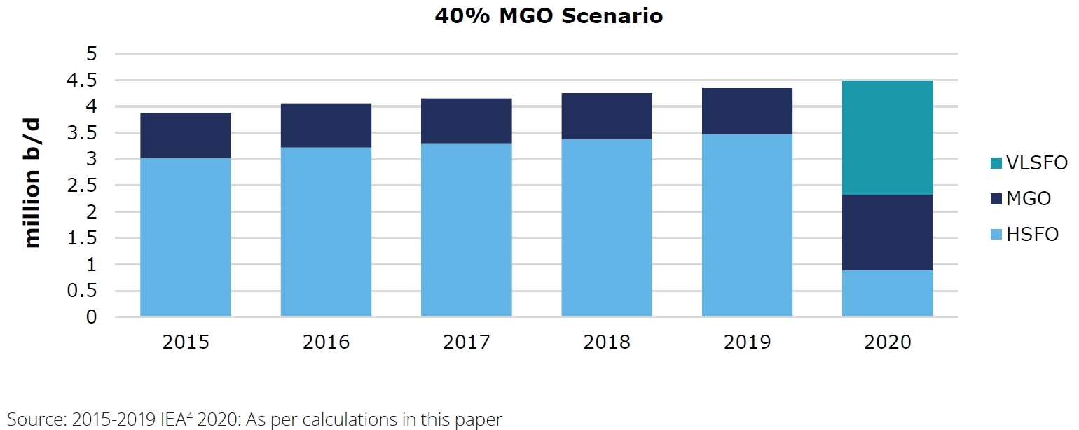 Już pod koniec 2019 r. przewidywano, że popyt na HSFO z wysoką zawartością siarki będzie spadał. Deloitte w analizie dla IMO założył dwa scenariusze rozwoju sytuacji. Eksperci tej firmy zakładają, że zapotrzebowanie na paliwo bunkrowe będzie utrzymywało się na poziomie około 3,6 mln baryłek. Natomiast podział na popyt MGO i LSFO może przyjąć różny rozkład. W jednym ze scenariuszy popyt wyniesie 60% MGO, a w drugim 40% MGO. W pierwszym przypadku, jeśli 60% popytu bunkru będzie stanowiło MGO, to będzie oznaczać zapotrzebowanie na 2,16 mln b/d (baryłek dziennie), przy około 0,9 mln b/d. Jeśli popyt wyniesie 40% MGO, to będzie odpowiadać zapotrzebowaniu na poziomie 1,44 mln baryłek dziennie. Wtedy popyt na VLSFO wyniesie około 2,16 mln b/d. Wydaje się, że przy zmniejszonych zamówieniach na nowe instalacje oraz w wyniku względnie małej różnicy cen różnych rodzajów bunkru drugi scenariusz jest bardziej prawdopodobny.