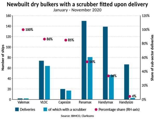 Montaż skruberów jest wiec popularny w segmencie supertankowców. Gibson szacuje, że aktualnie około 31% floty zbiornikowców jest już wyposażonych w systemy płuczące spaliny wylotowe statków. Analizując aktualne portfele zamówień przewiduje się, że do końca 2021 r. udział ten wzrośnie do około 40%. Montaż płuczek ma uzasadnienie finansowe w przypadku większych statków, które zużywają duże ilości paliwa. Na tych statkach, stopa zwrotu ze środków zainwestowanych w modernizację siłowni na przyjazną dla środowiska jest większa niż w przypadku montażu płuczek na statkach małych. Faktycznie 2020 r. nie przyniósł armatorom oczekiwanych oszczędności, ponieważ różnica między paliwami o wysokiej i niskiej zawartości siarki była niewielka. To efekt długotrwałego utrzymywania się nadpodaży ropy naftowej i względnie niskich cen bunkru.