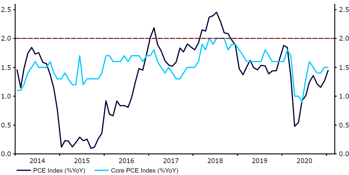 Uważamy, że Fed nie będzie zaniepokojony wzrostem inflacji powyżej założonego celu 2% w tym roku, jeśli uzna go za przejściowy. Warto pamiętać, że preferowana przez Rezerwę Federalną miara inflacji, indeks PCE, od października 2018 roku każdego miesiąca pokazuje dynamikę niższą niż 2% (Wykres 2). Oznacza to, że inflacja musiałaby utrzymywać się powyżej celu 2% przez długi czas, by indeks ten osiągnął średnio ponad 2%.