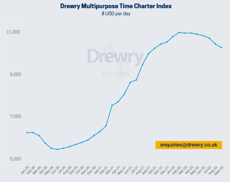 Rynek przewozów ładunków ciężkich i ponadgabarytowych odnotowywał dalsze spadki frachtów i stawek czarterowych w miesiącu sierpniu i na początku września. Potwierdzeniem tej tendencji były wyniki znanego w tym segmencie indeksu, tj. Drewry Multipurpose Index, który wskazuje średnie dzienne stawki czarterowe na bazie wybranego koszyka jednostek wielozadaniowych. Indeks wskazywał średni poziom stawek czarterowych w sierpniu na USD 10,650. Był to spadek w stosunku do miesiąca lipca o 2,5%.