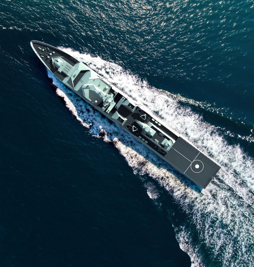 wizualizacje wskazują na uzbrojenie w dwie armaty morskie (na przedzie 76 mm i z