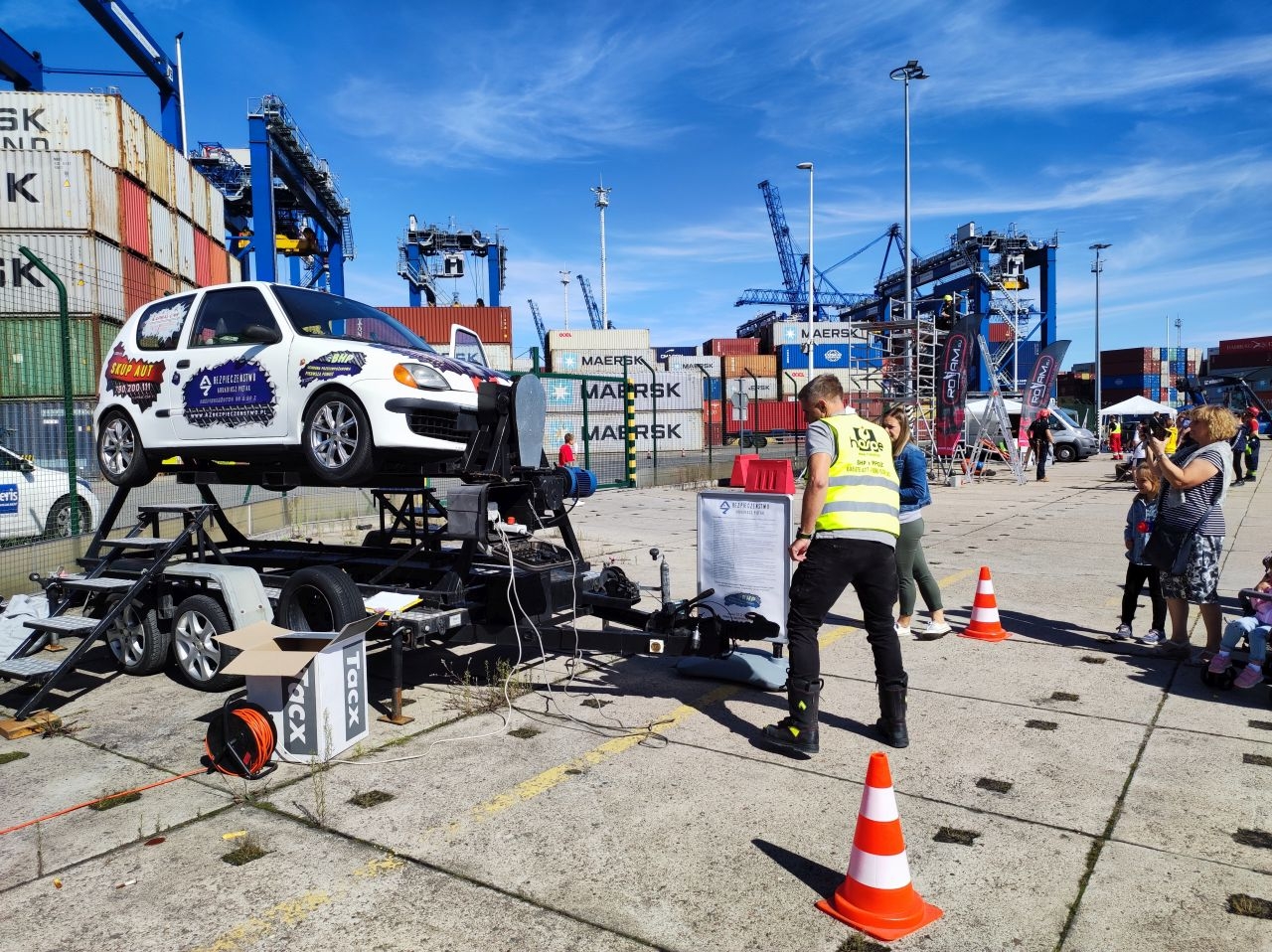 Wagę kontenerów i zniszczenia, do jakich może dojść podczas wypadku, miał uświadomić publiczności pokaz ustawienia pustego kontenera (kontener o długości 6 metrów waży 2200 kg) na samochodzie. Okazuje się, że nawet podczas spokojnego osadzania kontenera na pojazd, został on zgnieciony jak puszka.