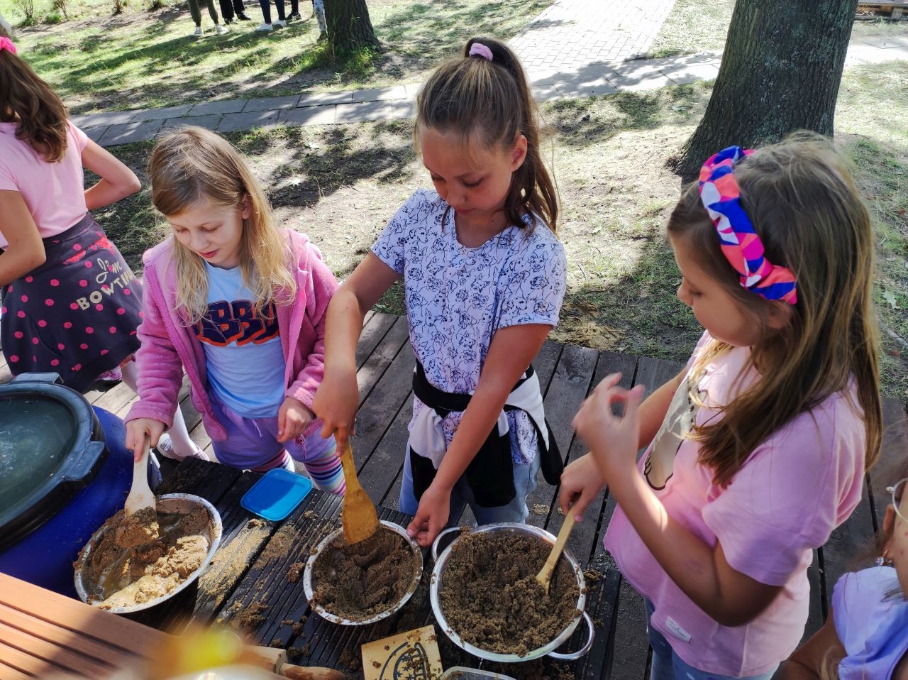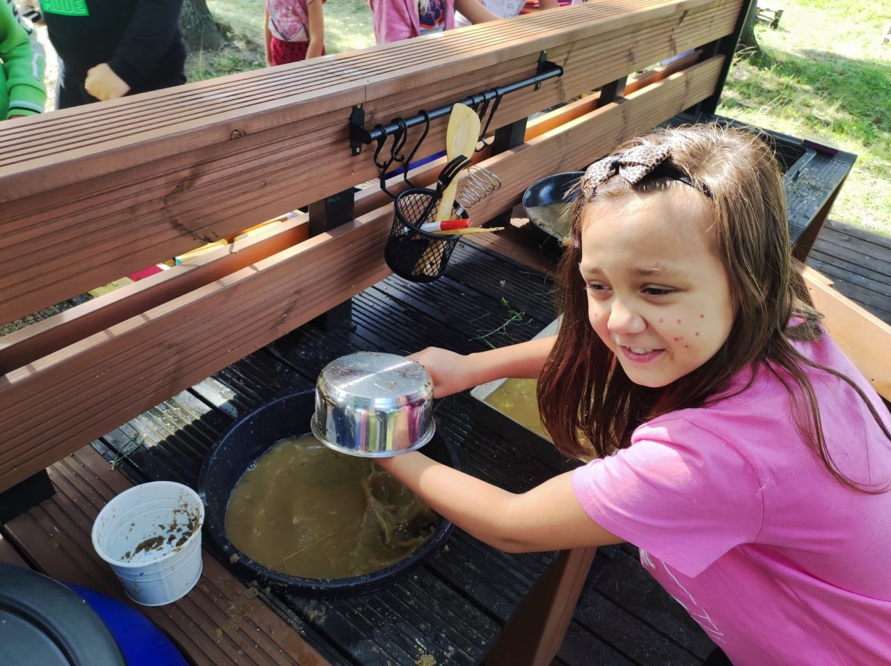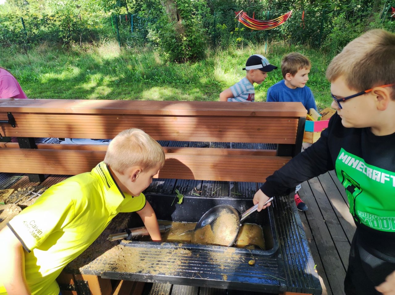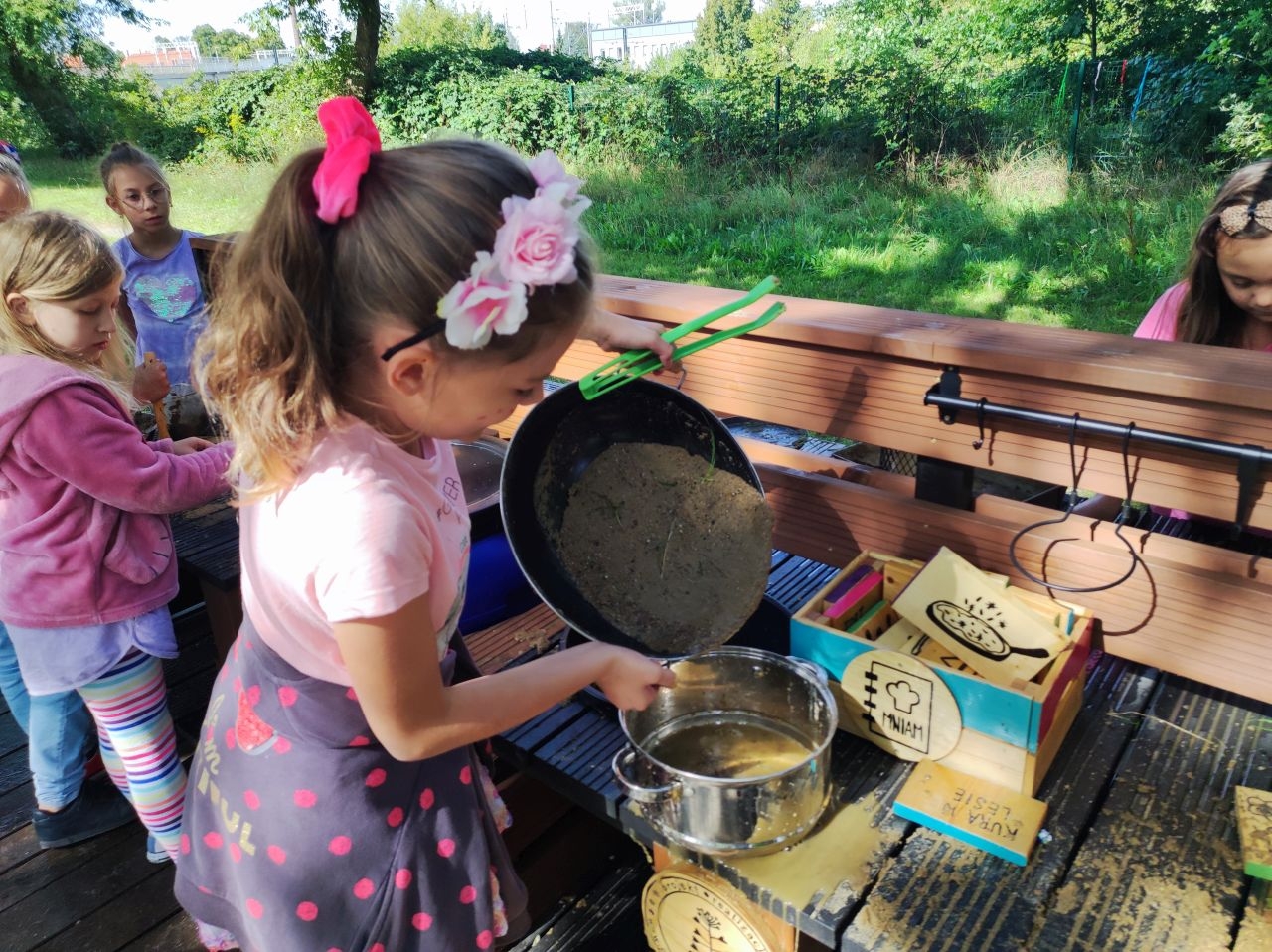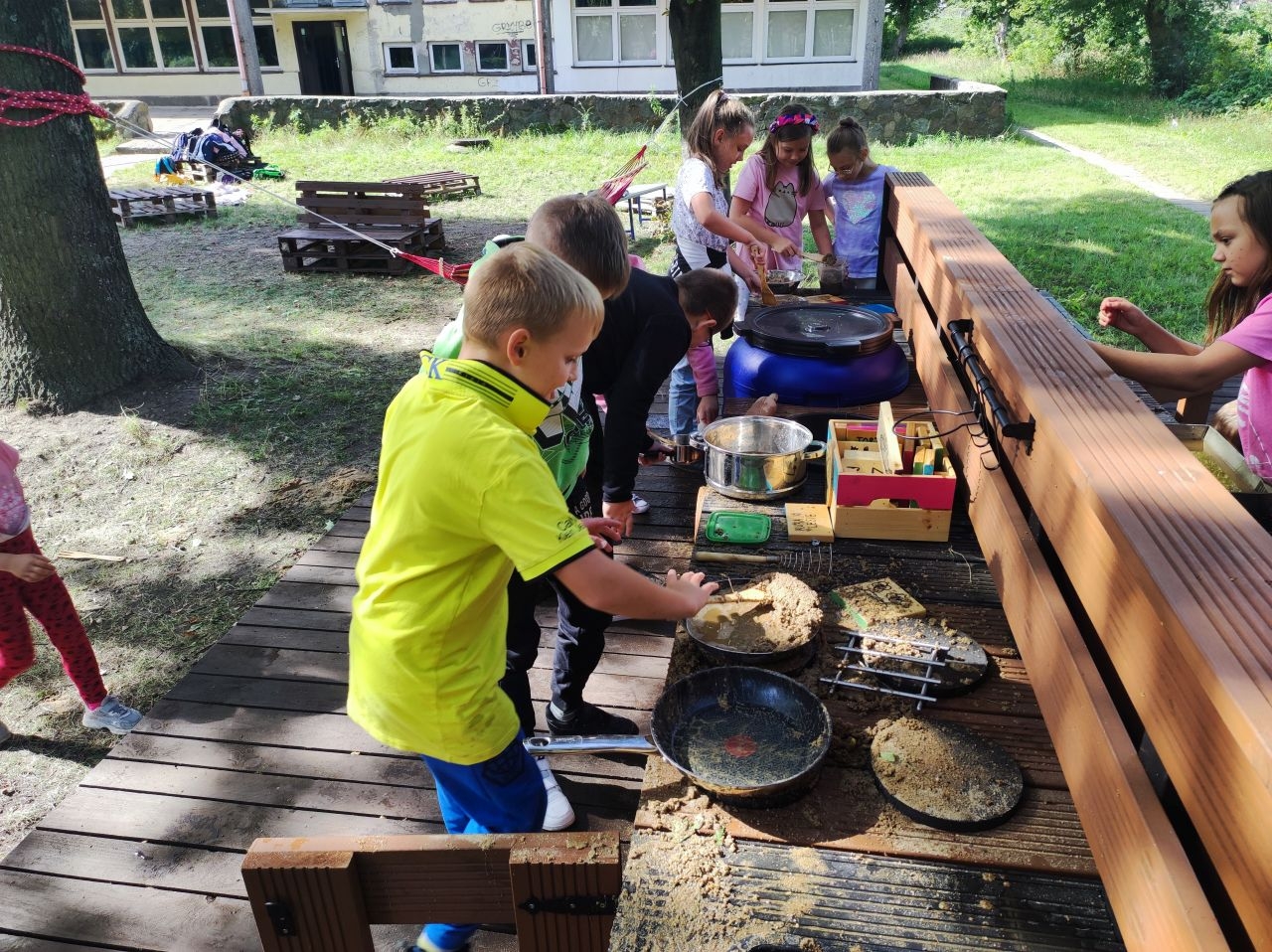 Finałem projektu jest uzupełnienie wyposażenia placu zabaw dla uczniów o drewniane elementy służące swobodnej zabawie. Szczególnie miejsce zajmuje kuchnia błotna.