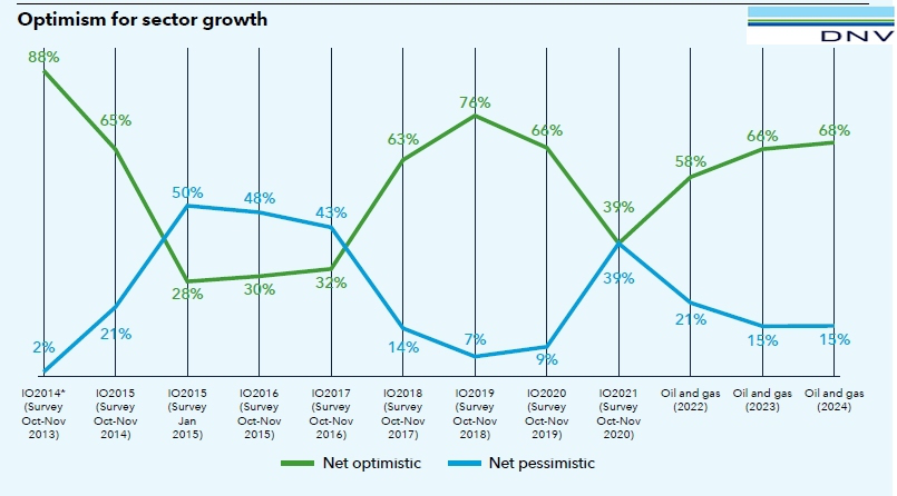 Dobre ceny ropy naftowej i gazu nie usypiają jednak menedżerów działających w tej branży. Prowadzone są inwestycje w energię wiatrową, słoneczną, wodór, wychwytywanie, utylizację i składowanie dwutlenku węgla. Prowadzone są prace nad produkcją biopaliw. Wymienione aktywności zaczynają generować nowe źródła przychodów – zauważają specjaliści DNV i FT.