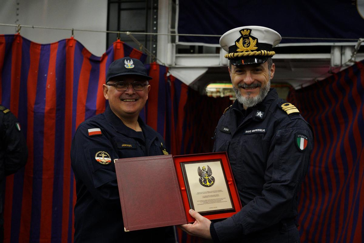 W związku ze "zmianą warty" odbyła się uroczystość, w której wzięli udział dowódcy obu włoskich fregat, a także przedstawiciele wyższej kadry dowódczej polskiej Marynarki Wojennej na czele z wiceadm. Krzysztofem Jaworskim, dowódcą Centrum Operacji Morskich-Dowództwa Komponentu Morskiego. Dla delegacji z przybyłego w piątek okrętu była to okazja do zapoznania się z zadaniami polskiej jednostki, omówienia współpracy w zakresie wykonywania zadań na morzu, jak i dotychczasowego przebiegu misji trwającej od maja ubr., gdy rozpoczął ją niszczyciel rakietowy typu Orizzonte, ITS Caio Duilio (D554), obecny na polskich wodach do lipca.