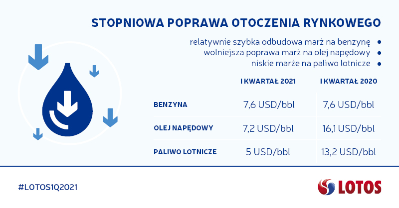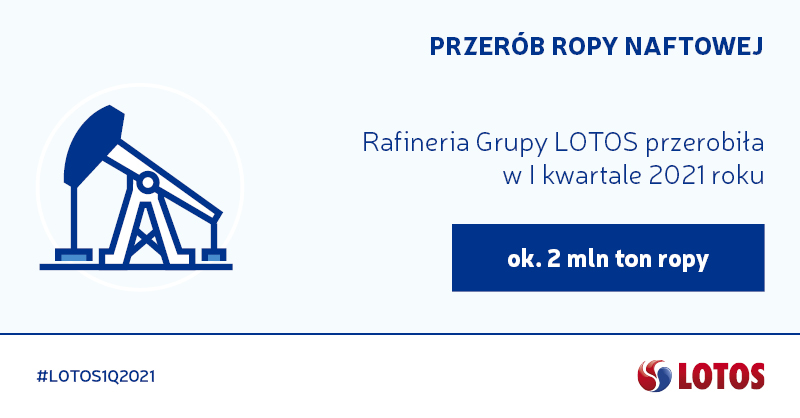 Na pracę rafinerii LOTOSU w I kw. 2021 r. wpływał planowy remont zakładu. W związku z główną częścią postoju remontowego, realizowanego w przeważającym zakresie w marcu 2021 r., rafineria realizowała przerób ropy naftowej na poziomie ok. 2 mln. ton, co przełożyło się na wykorzystanie mocy wytwórczych rafinerii na obniżonym poziomie 88,4%.