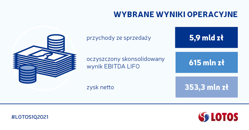 Grupa Kapitałowa LOTOS wykazała w I kw. 2021 r. zysk operacyjny w wysokości 664,3 mln zł, na który składały się zysk operacyjny segmentu produkcji i handlu: 554,8 mln zł, zysk operacyjny segmentu wydobywczego: 107,1 mln zł oraz korekty konsolidacyjne w wysokości +2,4 mln zł. Spółka wypracowała 5,9 mld zł przychodów ze sprzedaży. Oczyszczony skonsolidowany wynik EBITDA LIFO wyniósł 615 mln zł. W pierwszych 3 miesiącach tego roku koncern wypracował skonsolidowany zysk netto na poziomie 353,3 mln zł.