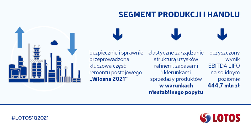 W okresie remontu koncern sprzedawał zapasy produktów zgromadzone w trakcie 2020 r. oraz korzystał z wysokiej opłacalności importu oleju napędowego, sprowadzając 9 morskich ładunków tego produktu (ok. 270 tys. ton). Spółka zwiększyła też sprzedaż lekkiego oleju opałowego, korzystając ze zwiększonego popytu związanego z niskimi temperaturami. W I kw. 2021 r. wzrosła opłacalność morskiego eksportu benzyny surowej, dlatego spółka, dzięki nadmorskiej lokalizacji rafinerii, szybko i elastycznie reagowała na zwiększony popyt. Dużą okazją rynkową okazały się także notowania olejów bazowych, z historycznie wysoką marżowością. Oczyszczony wynik EBITDA LIFO segmentu produkcji i handlu w I kw. 2021 r. wyniósł 444,7 mln zł.