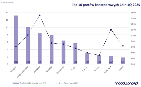 Największy udział w obrotach posiadają oczywiście chińskie porty, które obsłużyły 61,1 mln TEU (+8,4%). Warto dodać, że pierwsze trzy porty zwiększyły przeładunki o blisko 3 mln TEU. Co więcej, już dwa z nich Szanghaj oraz Ningbo osiągnęły ruch przekraczający dziesięć milionów TEU w jednym kwartale. Najszybciej rosnącym portem kontenerowym Chin był jednak Shenzhen, gdzie przeładunek wzrósł o 1,23 mln TEU (+17,1%). Jako że Shenzhen jest chińskim centrum produkcji urządzeń elektronicznych tak wysoki wzrost był najprawdopodobniej związany ze wzmożonym eksportem produktów do Stanów Zjednoczonych.