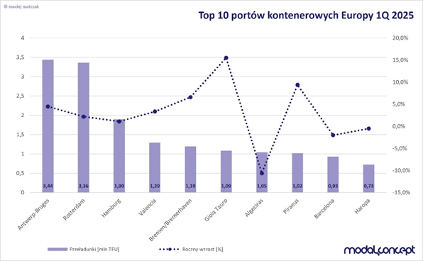 Najciekawszym wydarzeniem pierwszego kwartału w portach europejskich była zmiana rynkowego lidera bowiem porty Antwerpia-Brugia (3,44 mln TEU) nieznacznie wyprzedziły dominujący od lat Rotterdam (3,36 mln TEU) w liczbie obsłużonych kontenerów. Pierwsze dziesięć europejskich portów przeładowało łącznie 16,0 mln TEU, co oznacza wzrost o 2,7%. Spadki przeładunków zanotowały dwa hiszpańskie porty oraz francuski. Ruch kontenerowy w Algeciras spadł o 10,6%, natomiast w Barcelonie o 2,0%. W przypadku portów Haropa spadek wyniósł 0,5% (dane szacunkowe). W pozostałych portach notowano wzrosty, które miały najwyższy bezwzględny poziom w belgijskich portach Antwerpii-Brugii oraz włoskiej Gioia Tauro (+0,15 mln TEU). Szybko rosły również przeładunki Pireusu (+9,4%).