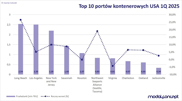 Najszybciej rosnącym rynkiem kontenerowym w analizowanej perspektywie były Stany Zjednoczone, co jest znaczącym zjawiskiem w kontekście działań politycznych wymierzonych w partnerów handlowych. Perspektywa wysokich ceł napędzała bowiem popyt na przewozy morskie, bowiem importerzy chcąc zdążyć przed ich wdrożeniem znacząco zwiększyli dostawy na rynek amerykański. W rezultacie dziesięć największych portów kontenerowych USA zwiększyło swoje obroty o blisko 10% w porównaniu do pierwszego kwartału ubiegłego roku. Łącznie porty te przeładowały 13 mln TEU, z czego blisko połowę porty w Long Beach i Los Angeles. Long Beach był portem który uzyskał jednocześnie największy przyrost, bowiem zwiększył obroty o ponad pół miliona TEU (+26,6%) i został rynkowym liderem. Spadek obrotów zanotowały dwa z czołowych amerykańskich portów Virginia i Houston, jednakże nie były to duże ograniczenia.