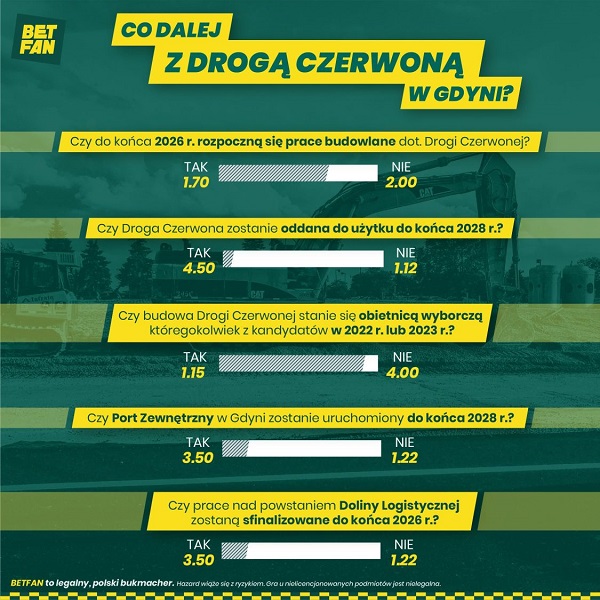 Według analityków BETFAN, legalnego polskiego bukmachera, Trójmiasto doczeka się w końcu budowy Drogi Czerwonej, mającej połączyć gdyński port z siecią dróg krajowych. Zdaniem BETFAN prace budowlane przy tej inwestycji ruszą w ciągu pięciu lat, tj. do końca 2026 r. Czy jednak, zgodnie z zapowiedziami, łącznik powstanie do 2028 r.? Czy Droga Czerwona ponownie stanie się tematem kampanii wyborczej w Trójmieście? I co z innymi projektami: Portem Zewnętrznym czy Doliną Logistyczną, wokół której toczy się właśnie przetarg?