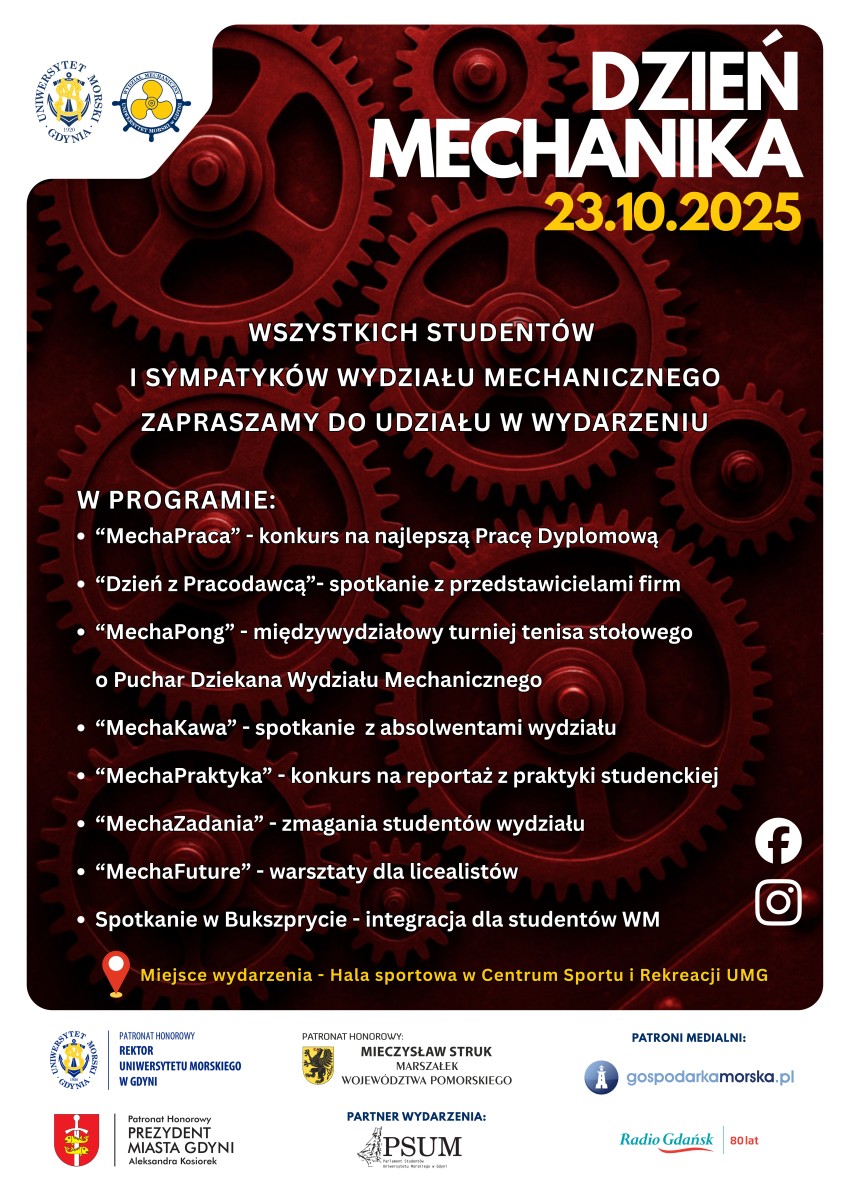 W czwartek, 23 października 2025 roku, Wydział Mechaniczny Uniwersytetu Morskiego w Gdyni po raz piąty zaprosi studentów, wykładowców i partnerów biznesowych na „Dzień Mechanika” – wydarzenie, które łączy edukację, innowacje i świat przemysłu.