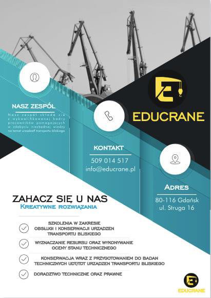 EDUCRANE została założona przez byłego inspektora Transportowego Dozoru Technicznego, specjalizującego się w urządzeniach transportu bliskiego oraz ciągłego. Nasz zespół posiada ogromne doświadczenie podczas wieloletniej pracy w dziedzinie maszyn ciężkich roboczych. Dokładamy wszelkich starań aby nasi klienci byli w pełni zadowoleni z naszych usług.