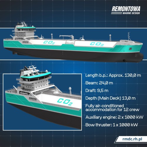 Biuro projektowe Remontowa Marine Design & Consulting z siedzibą w Gdańsku zaprezentowało swoją koncepcję ekologicznego statku przeznaczonego do transportu ciekłego dwutlenku węgla CO2. RMDC 4580 LCO2 Carrier 12000m3 ma wpisywać się w koncepcje dekarbonizacji żeglugi, wykorzystując nowoczesne rozwiązania związane z wykorzystaniem nisko- i zeroemisyjnych środków napędu. W ten sposób jednostka transportowa ma jednocześnie wykonywać obowiązki zgodnie z przeznaczeniem oraz pozostawać przyjazną środowisku naturalnemu.
