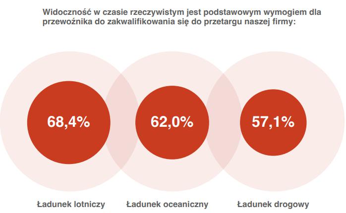 Wyniki badania wskazują też, że przewoźnicy, którzy nie są w stanie zapewnić załadowcom oprogramowania Real-Time Visibility (RTV) przez cały cykl życia przesyłki, mogą znaleźć się w przyszłości w trudnej sytuacji na tle konkurencji. Ponad połowa załadowców (57,4 proc.) uważa visibility za wstępny wymóg dla przewoźnika do zakwalifikowania się do przetargu. W przypadku blisko 41 proc. załadowców widoczność w czasie rzeczywistym jest atrakcyjną opcją. Największą wagę do Real-Time Visibility (RTV) przywiązują przewoźnicy korzystający z transportu lotniczego, a w następnej kolejności oceanicznego i drogowego.