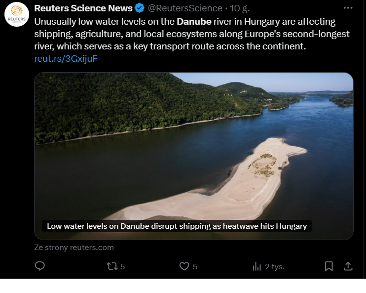 Na Węgrzech wyjątkowo niski poziom wody w Dunaju zagraża transportowi, rolnictwu i ekosystemowi wokół drugiej najdłuższej rzeki w Europie. Alarmująco niski jest poziom Cisy i węgierskich wód gruntowych. Statki towarowe muszą zostawiać ponad połowę ładunku i mogą działać tylko z 30-40 proc. wydajnością - powiedział Attila Bencsik, wiceprezes Węgierskiego Stowarzyszenia Żeglugowego.