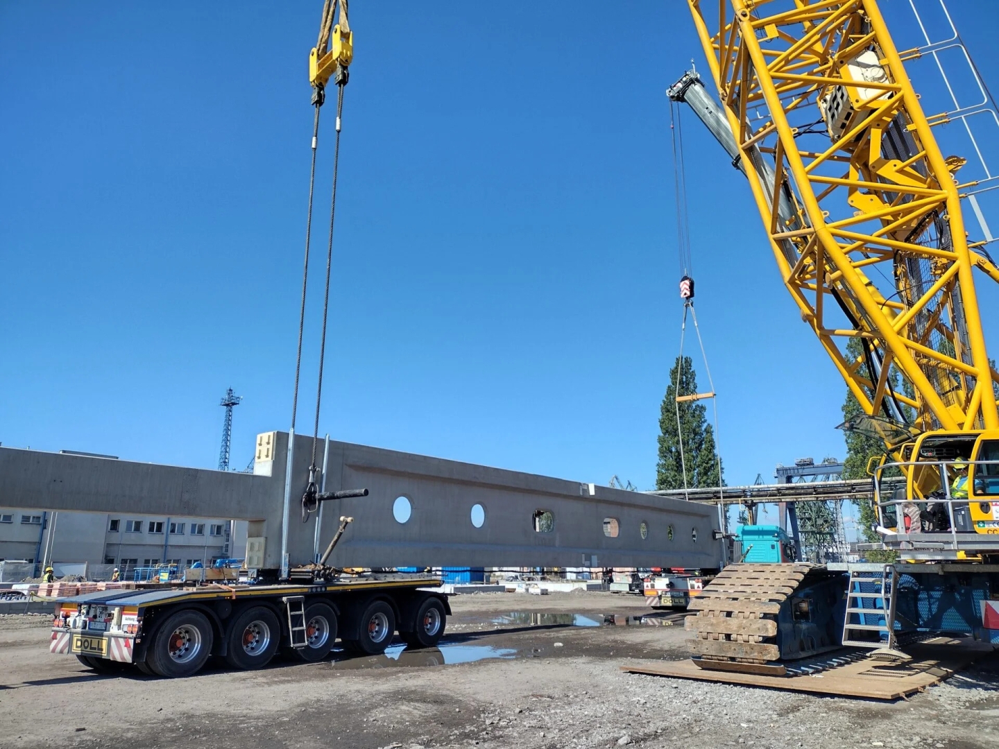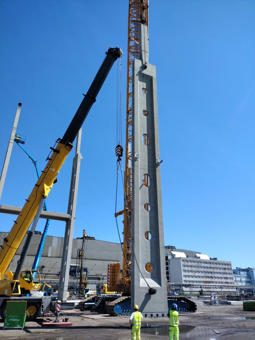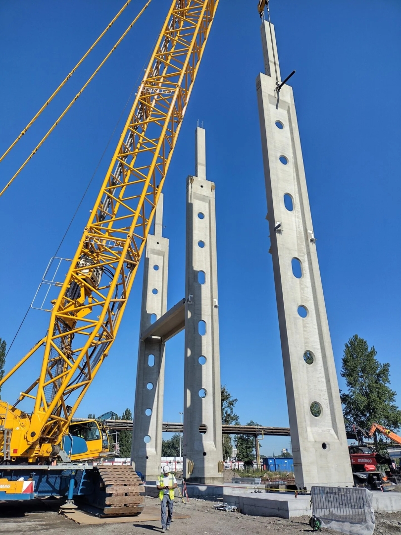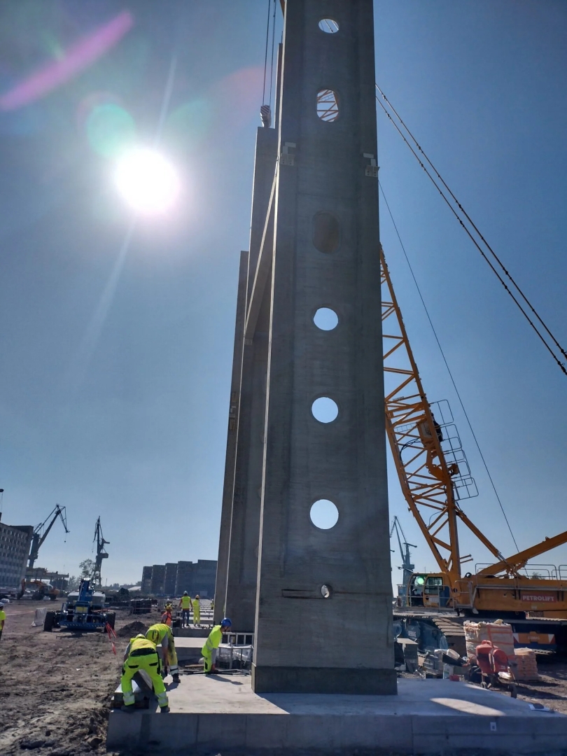 – Plan podnoszenia słupa nie dopuszczał możliwości montażu przy pomocy jednego żurawia, ponieważ groziło to skręceniem/ wywróceniem słupa. Dlatego montaż słupów odbywa się przy pomocy dwóch żurawi. Za bezpośredni montaż słupów odpowiada żuraw gąsienicowy o klasie 500 ton i drugi pomocniczy w trakcie obracania w powietrzu o klasie 300 ton – dodaje Łukasz Praszczyk z zespołu budowy.