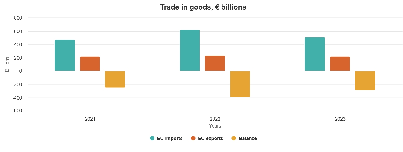 Chiny są drugim co do wielkości partnerem handlowym UE w zakresie wymiany towarowej po Stanach Zjednoczonych, a dwustronny handel osiągnął 739 mld EUR w 2023 r. Stanowi to spadek o 14% w porównaniu z 2022 r. – wynika z danych Eurostatu. Chiny są trzecim co do wielkości partnerem UE w zakresie eksportu i największym w zakresie importu. Bilans handlowy UE-Chiny jest stale korzystny dla Chin. W 2023 r. deficyt UE wyniósł 292 mld EUR. Eksport UE do Chin wyniósł 223,6 mld EUR, podczas gdy import UE z Chin wyniósł 515,9 mld euro, co oznacza spadek o 3,1% i 18% w ujęciu rok do roku. Tylko przez 10 ostatnich lat gospodarki UE wpompowały więc w gospodarkę ChRL co najmniej 2 600 mld EUR. Do tego dochodzą bezpośrednie inwestycje zagraniczne, których wartość skumulowana od 2020 r. zbliżyła się do 180 mld EUR – wynika z danych Eurostat.