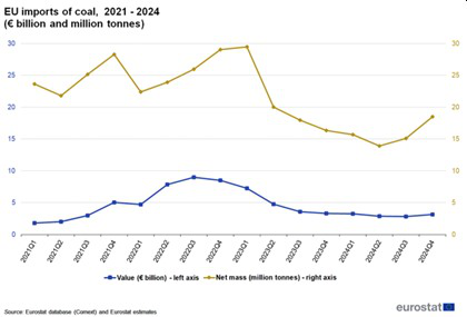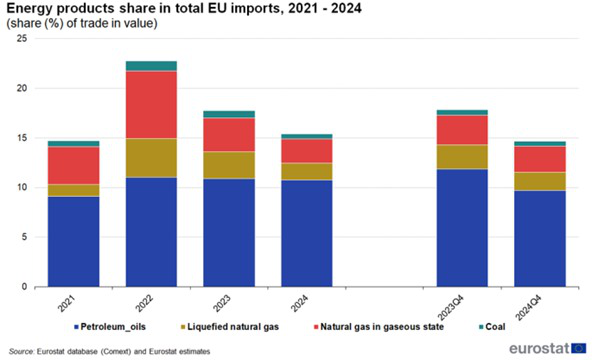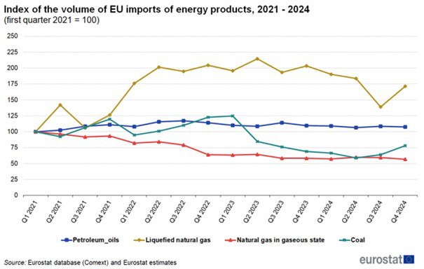 Analiza struktury importowanych surowców wykazuje, że w latach 2023–2024 najbardziej spadły koszty importu gazu ziemnego w postaci skroplonej oraz gazu ziemnego dostarczanego rurociągami. Udział węgla w ujęciu wartościowym w ogólnym imporcie UE nie uległ większym zmianom. Obserwując ostatnie 3 lata można zauważyć ewolucję wolumenu importu produktów energetycznych. W czwartym kwartale 2024 r. wolumen skroplonego gazu ziemnego wzrósł o 23,4% w porównaniu z poprzednim kwartałem i był o 71,6% wyższy niż w pierwszym kwartale 2021 r. – wylicza Eurostat.