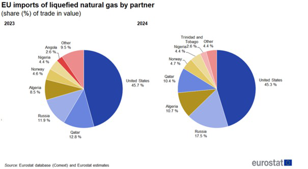 W efekcie sankcji i zmian dostawców, w 2024 r. największymi partnerami UE w dostawach ropy naftowej były Stany Zjednoczone (16,1%), Norwegia (13,5%) i Kazachstan (11,5%). Największy przyrost między 2023 a 2024 r. odnotowano z Kazachstanu (o 2,1%). Norwegia była największym dostawcą gazu ziemnego do UE w stanie gazowym w 2024 r. Jej udział zapewnił przemysłowi i konsumentom europejskim 45,6% potrzeb. Kolejnym dostawcą gazu do UE była w ubr. Algieria (19,3%). Trzecią pozycję zajęła Rosja z 16,6% udziałem. W porównaniu z rokiem 2023 udział Algierii wzrósł o 2,8%. Zmalały natomiast dostawy z Wielkiej Brytanii o 5,2%.