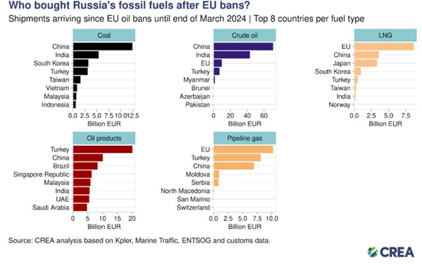Rosja była największym dostawcą węgla do UE w IV kw. 2021 r. z udziałem 47,9%. Piąty pakiet sankcji UE wprowadził zakaz zakupu, importu lub transferu węgla i innych stałych paliw kopalnych do UE, jeśli pochodzą one z Rosji lub są eksportowane z Rosji. W rezultacie udział Rosji w imporcie węgla do UE spadł do zera w czwartym kwartale 2022 r. W 2024 r. dwoma głównymi dostawcami węgla na rynek UE były Australia (37,3%) i Stany Zjednoczone (32,3%). Rynek UE stał się ostatnio mniej liczącym odbiorcą rosyjskich surowców energetycznych wynika z danych CREA opartych na informacjach Kpler, Marine Trafic oraz ENSOG z marca br.