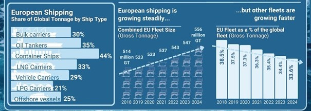 W światowej flocie masowców 30% tonażu kontrolowane jest przez armatorów z UE. 35% zbiornikowców znajduje się pod europejską kontrolą pod względem tonażu brutto. W przypadku kontenerowców 44% znajduje się pod europejską kontrolą pod względem tonażu brutto. Europejscy armatorzy kontrolowali również jesienią 2024 r. jedną trzecią lub więcej światowego GT w przypadku zbiornikowców LNG, promów, pogłębiarek i statków chłodniczych.