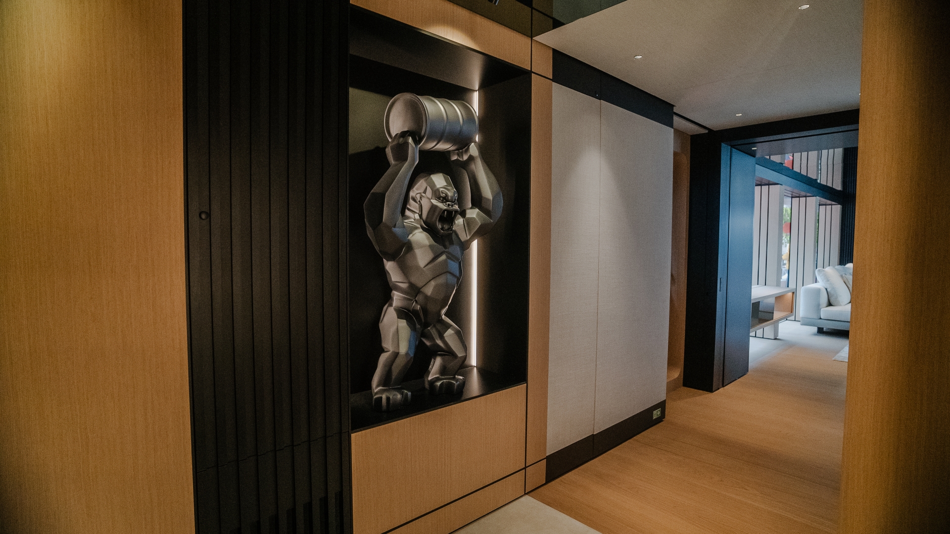 Jednym z najbardziej intrygujących elementów jachtu jest niewątpliwie rzeźba "Wild Kong Oil" autorstwa najlepiej sprzedającego się francuskiego artysty współczesnego, Richarda Orlinskiego. Umieszczona na pokładzie być może z nutą pewnej zuchwałości, jak gdyby nasz małpi przyjaciel wiedział dokładnie, jak nie na miejscu jest wśród minimalistycznie eleganckiego otoczenia jachtu. To gest w stronę niespodziewanego, wprowadzający odrobinę nonszalancji do wyrafinowanej atmosfery jednostki.