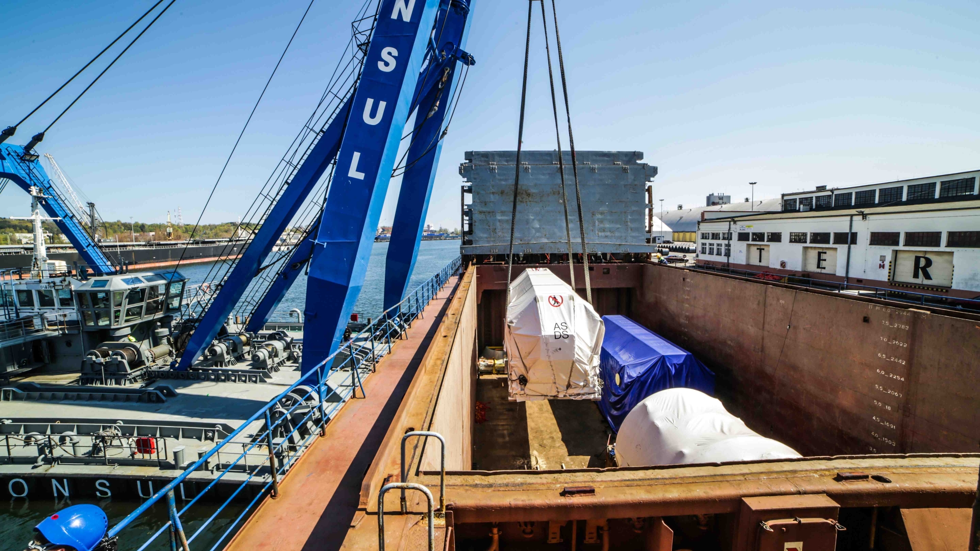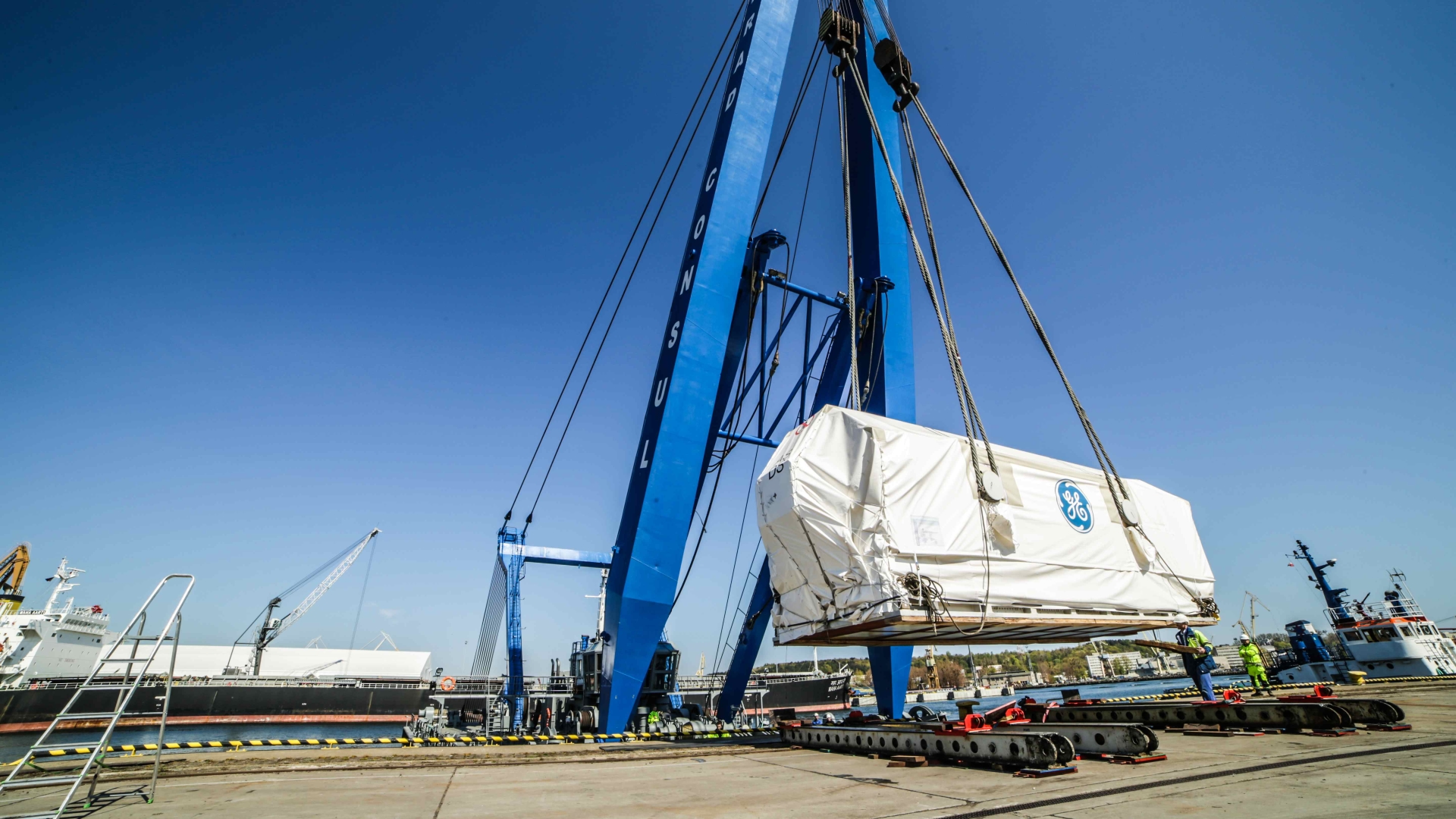 Sv. Apostol Andrey w gdyńskim porcie. Statek przypłynął po olbrzymie generatory. Do ich załadunku trzeba było użyć największego dźwigu pływającego w Polsce.