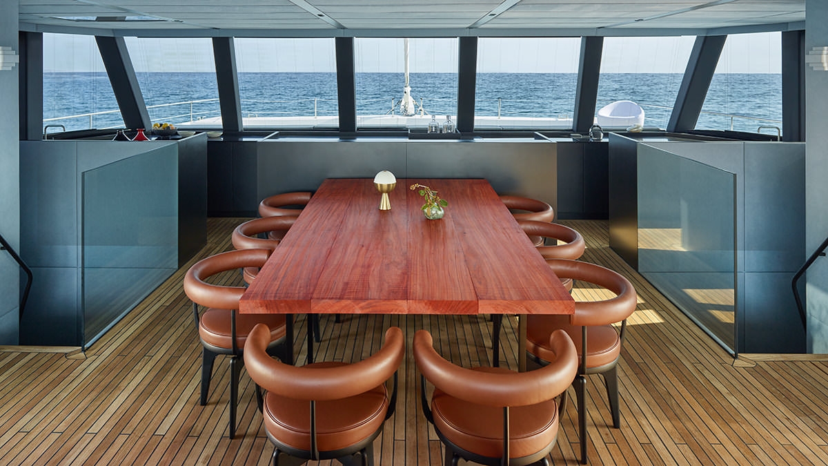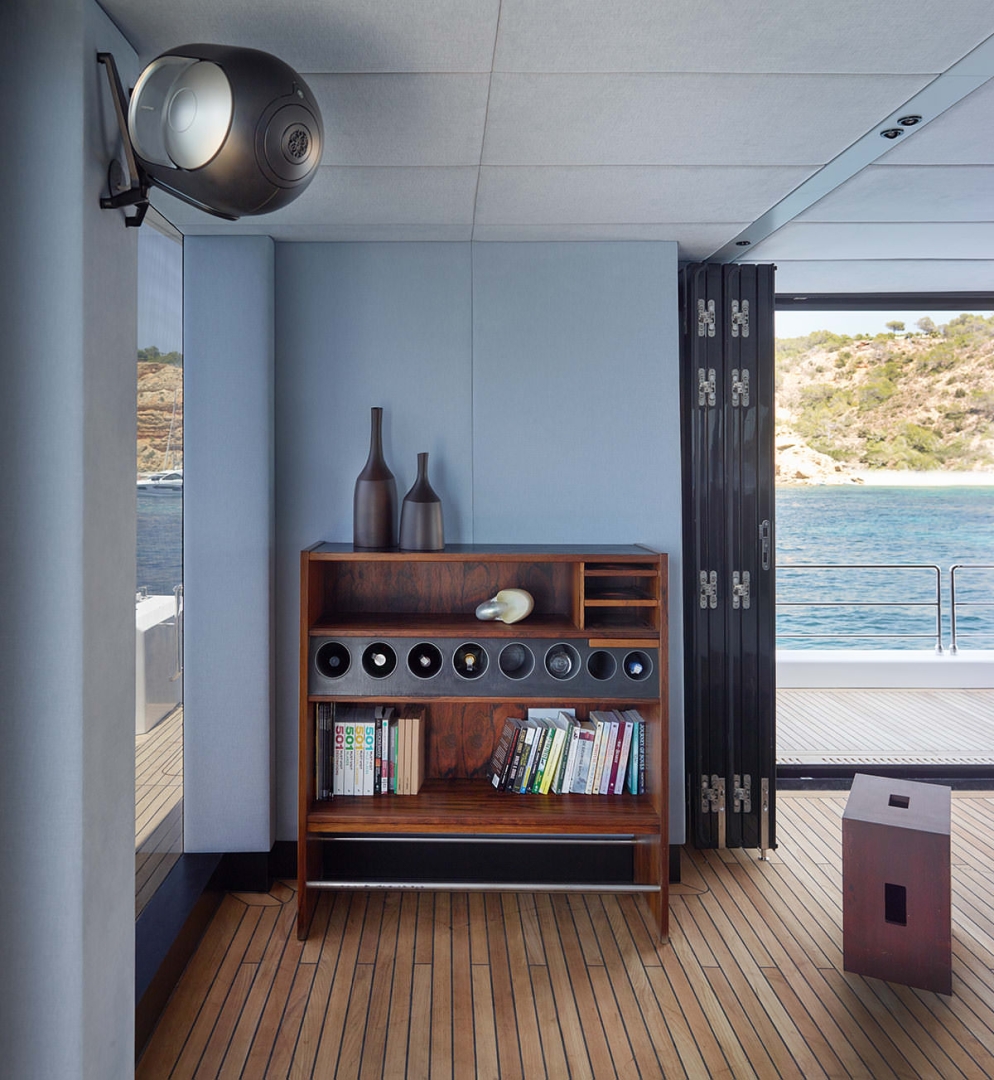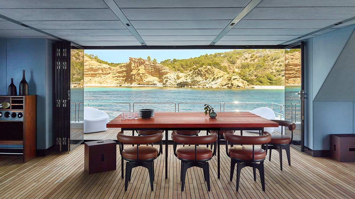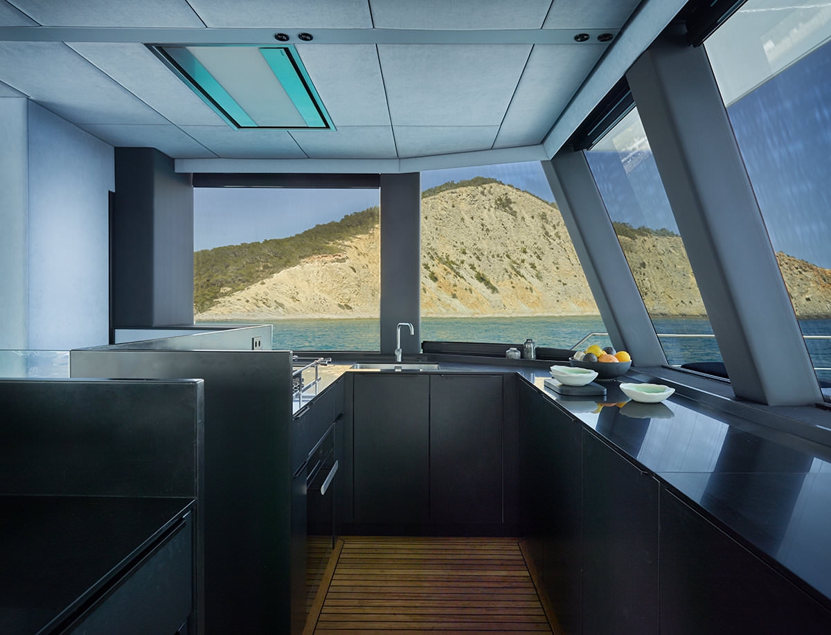 Obszerny i przeszklony ze wszystkich stron salon Midori z rozsuwanymi drzwiami , to ponad 65m² inteligentnie wykorzystanej powierzchni. W przedniej części jachtu znajduje się imponująca kuchnia rozciągająca się na całą szerokość pomieszczenia, w której centrum umiejscowiono blat, pod którym są lodówki, chłodziarki do wina, zamrażarka oraz kostkarka firmy Hoshizaki. Schowki oraz wyposażenie kuchenne kryją się za dyskretnymi czarnymi panelami zdobiącymi całą strefę jadalną. Główny blat sąsiaduje z dużym stołem, przy którym zasiąść może 8 gości.