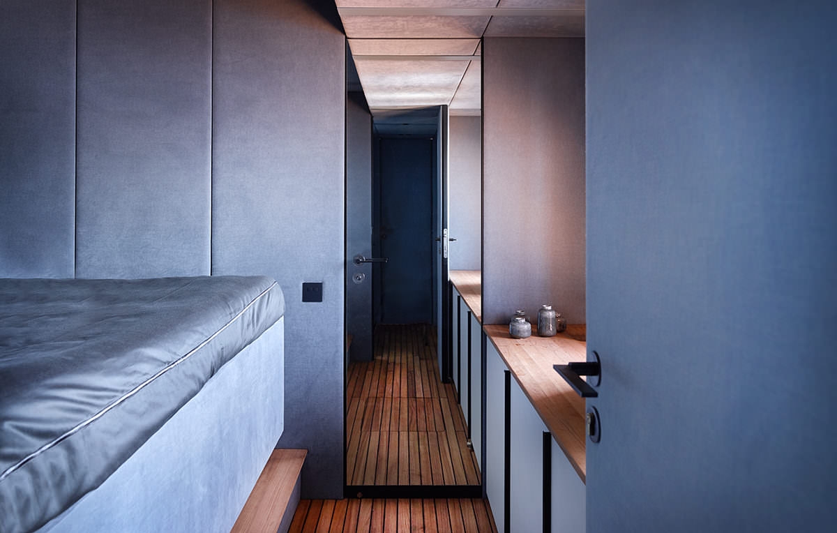 W kadłubach Midori znajdują się 3 kabiny gościnne oraz strefa armatora. Każda z przestrzeni odznacza się indywidualnym doborem barw, od lazuru po antracyt czy eukaliptusową zieleń. Wszystkie kabiny posiadają liczne schowki, wysuwane telewizory, dyskretnie wkomponowane nagłośnienie Fosgate oraz prywatne łazienki wyłożone kwarcowymi płytami i wyposażone w akcesoria firmy Vola. Strefa właścicielska zawiera ponadto obszerną garderobę, biurko, opuszczany z sufitu ekran oraz powiększoną - luksusową łazienkę.