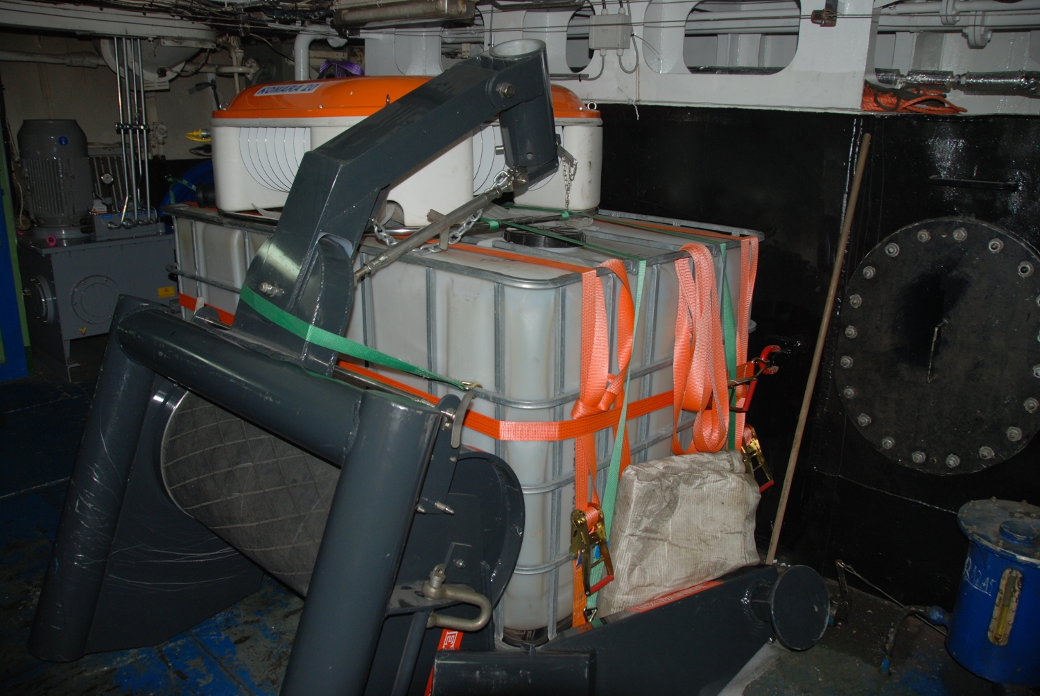 Nowy dźwig ma hydrauliczny napęd, ponad dziesięciometrowy wysięg, może obracać się o 360 stopni, jest sterowany bezpośrednio z konsoli lub mobilnego bezprzewodowego pilota. Dźwig pozwala na transport z ładowni na pokład oraz za burtę elementów systemu zapory i zbierania zanieczyszczeń z powierzchni wody (Skimmer), a także prowadzić na jednostce różne prace bosmańskie (np. transport ładunków). Służy również do opuszczania z pokładu SG-311 łodzi wykorzystywanej przez funkcjonariuszy z grup kontrolnych Morskiego Oddziału Straży Granicznej. Będący na wyposażeniu SG-311 ponton SŁP-5400 został wyposażony w hak Henriksena pozwalający na bezpieczne opuszczanie i podnoszenie łodzi. Hak Henriksena umożliwia ponadto automatyczne wypięcie łodzi z zawiesia w chwili zetknięcia się jej z lustrem wody. Konieczne przy tym było przeprowadzenie zmian konstrukcyjnych kadłuba pontonu.