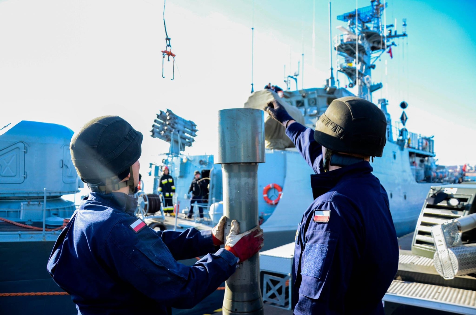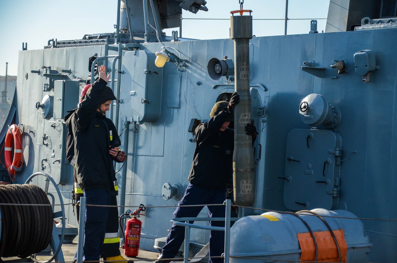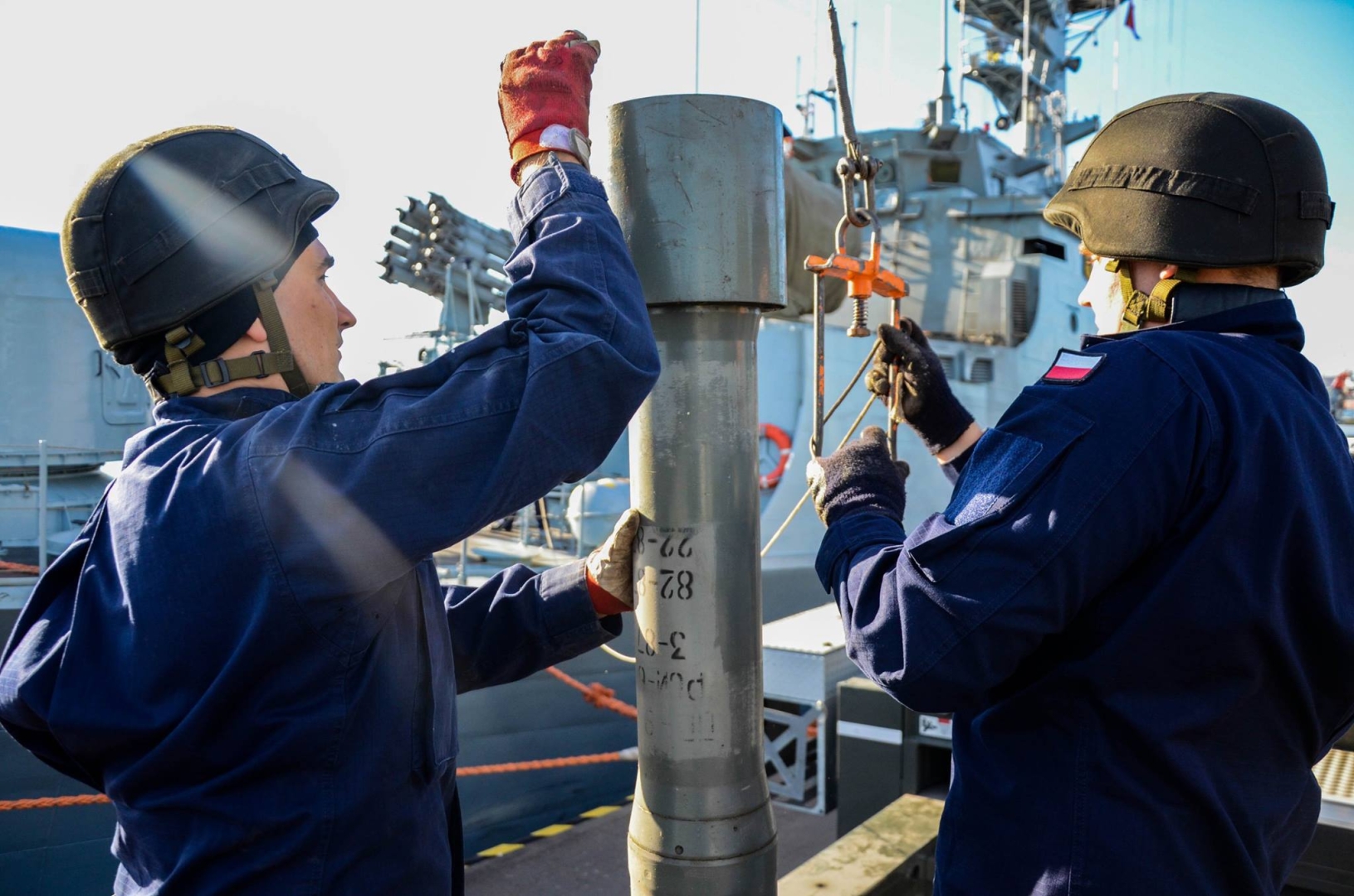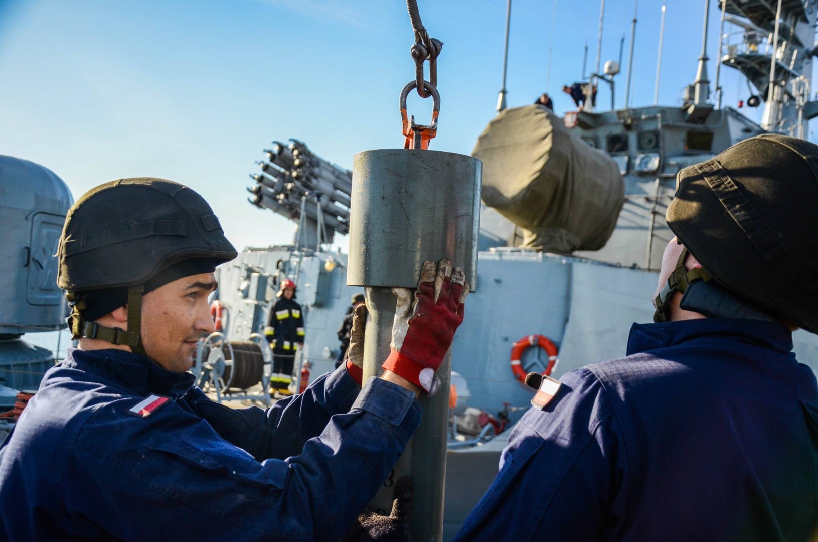 Strona główna Marynarka Wojenna, Bezpieczeństwo Morskie, Ratownictwo Załoga korwety ORP „Kaszub” podczas załadunku rakietowych bomb głębinowych