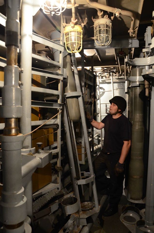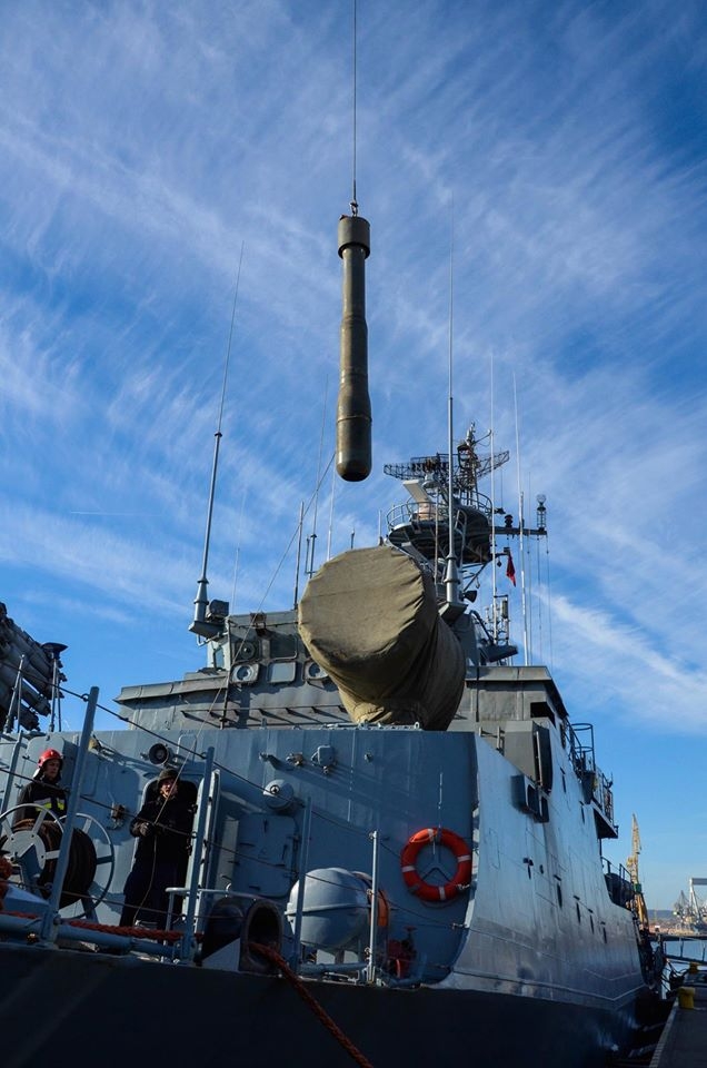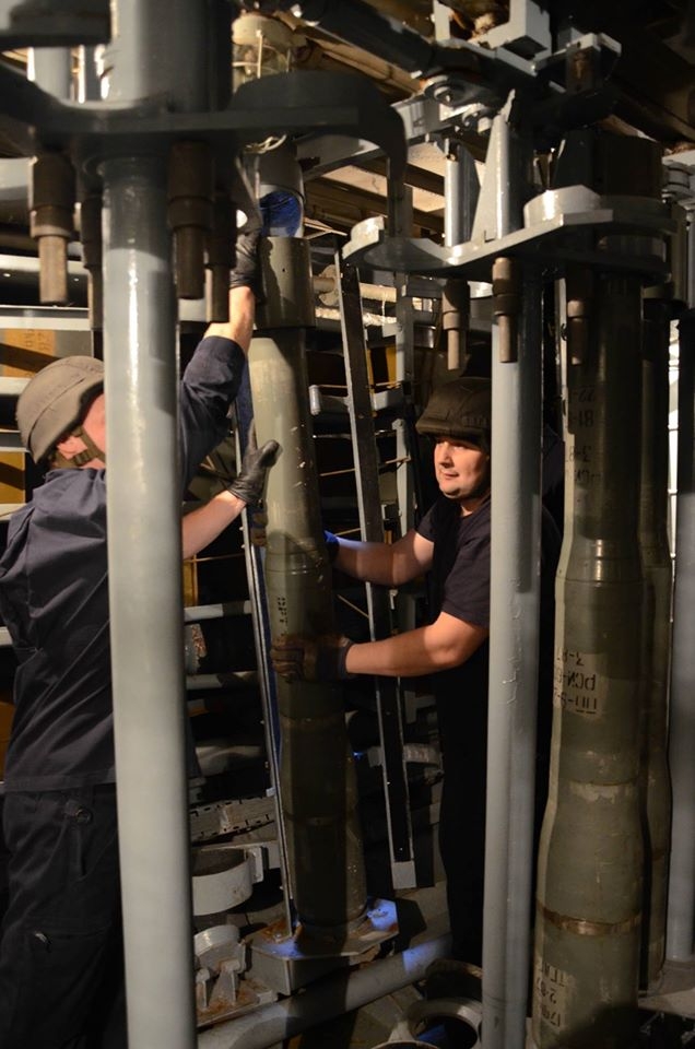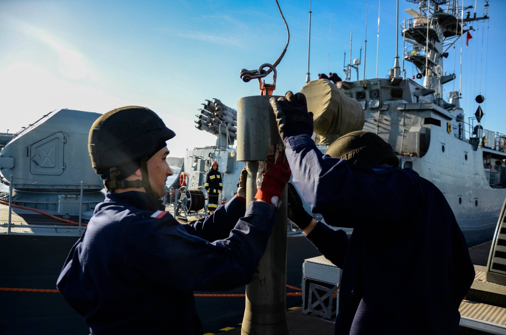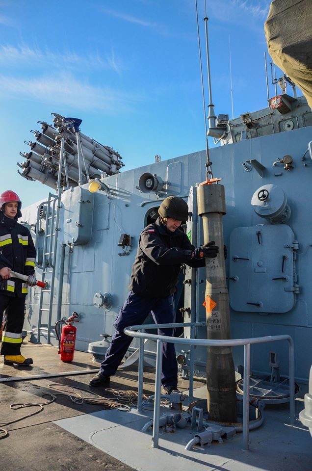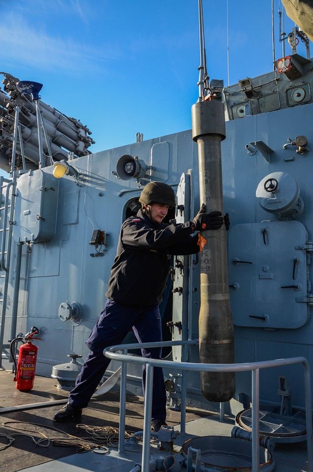 Strona główna Marynarka Wojenna, Bezpieczeństwo Morskie, Ratownictwo Załoga korwety ORP „Kaszub” podczas załadunku rakietowych bomb głębinowych