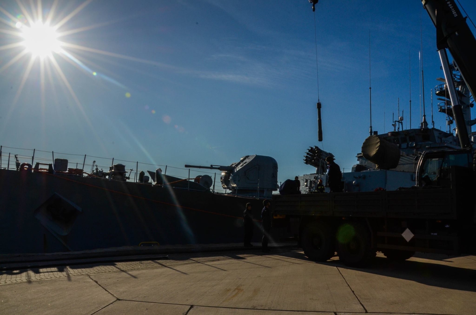 Załoga korwety ORP „Kaszub” podczas załadunku rakietowych bomb głębinowych