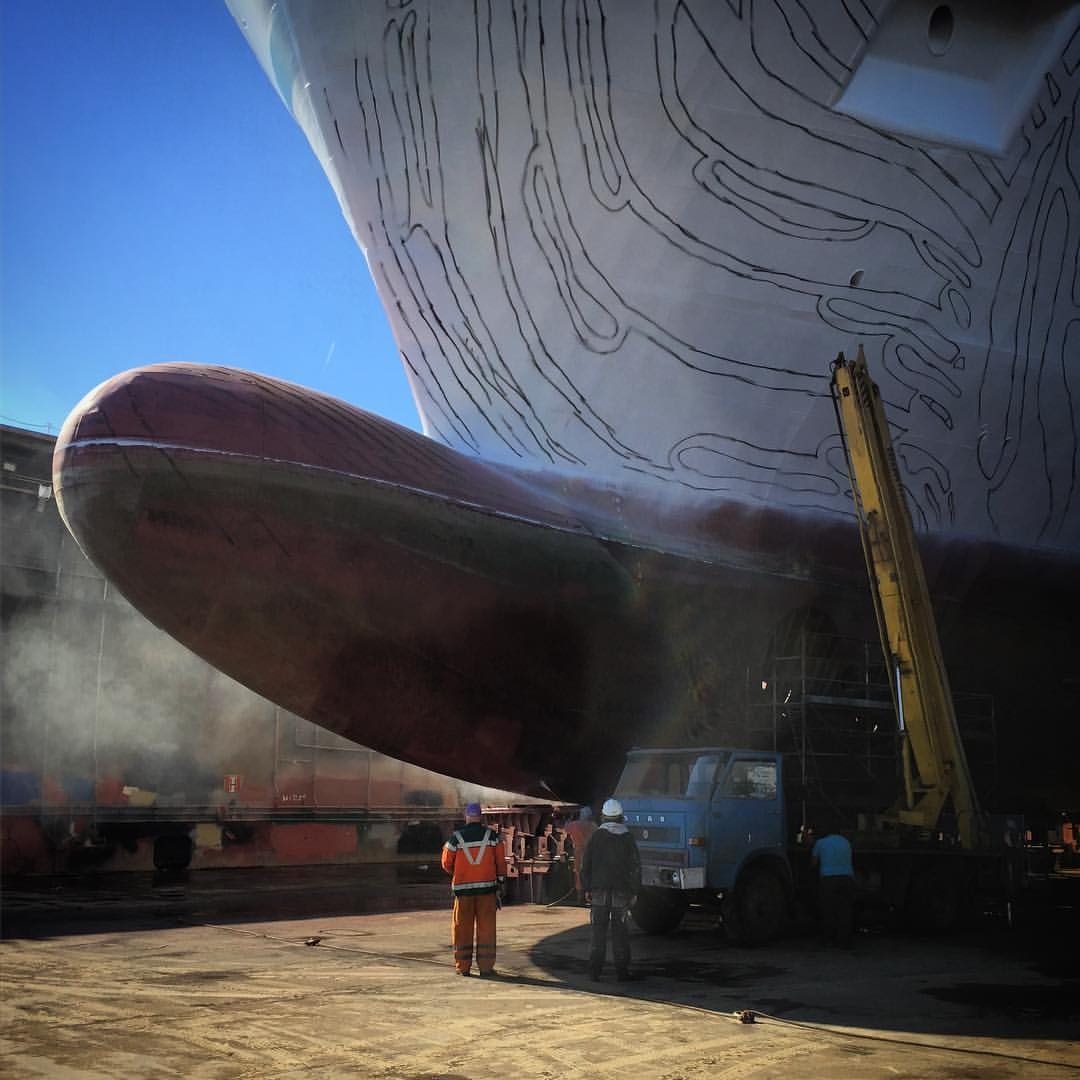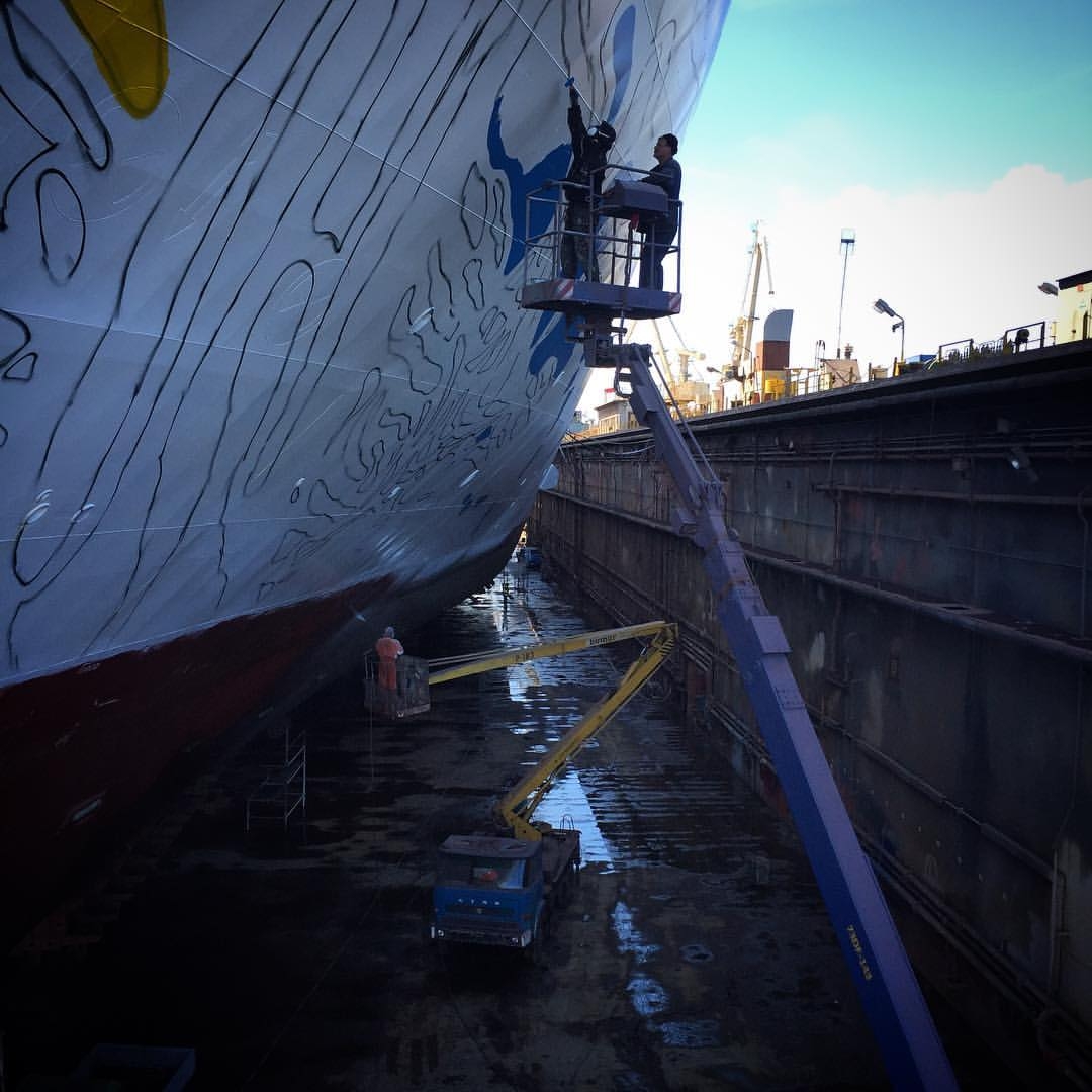 Street-artowy artysta, wykładowca w Akademii Sztuki w Szczecinie, Mariusz Waras zabrał się ostro do pracy. Postępy w upiększaniu dziobu nowego promu Polskiej Żeglugi Bałtyckiej uwidocznił na zdjęciach i opublikował na swoim profilu facebookowym.