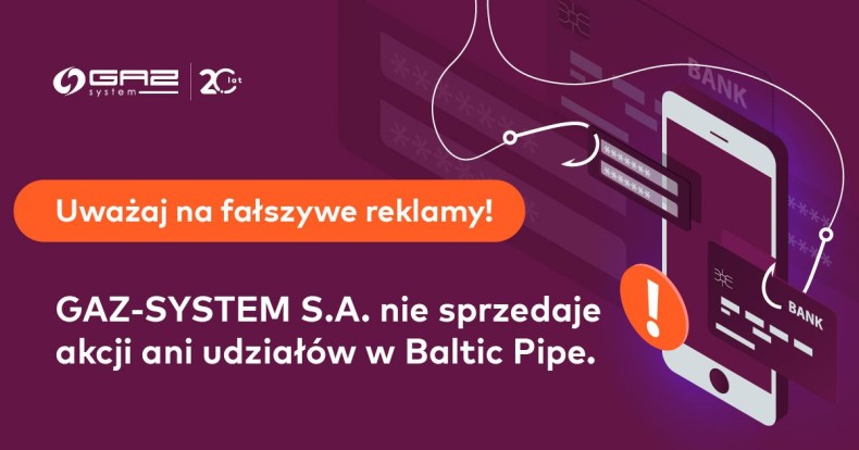 GAZ-SYSTEM ostrzega przed podszywającymi się pod spółkę telemarketerami oraz fałszywymi publikacjami w internecie. To próby wyłudzenia pieniędzy lub danych osobowych. Oszuści wykorzystują bezprawnie logo i projekty inwestycyjne naszej spółki, w tym projektu Baltic Pipe. Pamiętajmy, że GAZ-SYSTEM nie prowadzi żadnych działań nakłaniających do inwestowania na rzecz spółki.