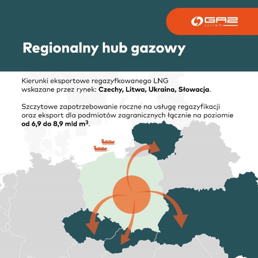 Prawie połowa regazyfikowanego LNG miałaby zostać przeznaczona na eksport w kierunku Ukrainy, Słowacji, Czech oraz Litwy. Szacowany wolumen eksportu wynosi od 6,9 do 8,9 mld m3, a w kolejnych dekadach może spaść do ok. 2,6 mld m3/r.