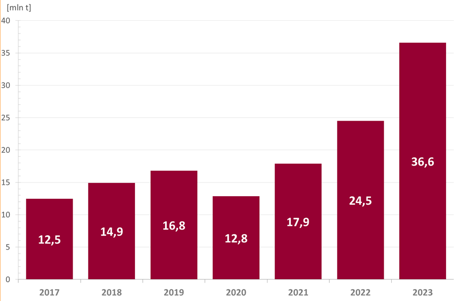 Firma przekazała, że w ubiegłym roku obsłużyła 471 zbiornikowców. Na jej terenie dokonano przeładunki ropy naftowej i paliw w wysokości 36,6 mln ton. To oznaczało, że były o 49% wyższe niż poprzedni, także rekordowy przeładowany tonaż, który za rok 2022 wyniósł 24,5 mln ton.