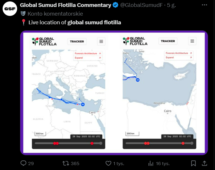 „Po dwóch dniach spędzonych na wodach greckich w celu dokonania napraw i uzupełnienia zapasów, Globalna Flotylla Sumud wypływa ponownie w morze. Z greckimi statkami u boku, jesteśmy w komplecie i wspólnie zmierzamy w kierunku Gazy” - napisała w nocy z soboty na niedzielę na platformie X Global Sumud Flotilla.
