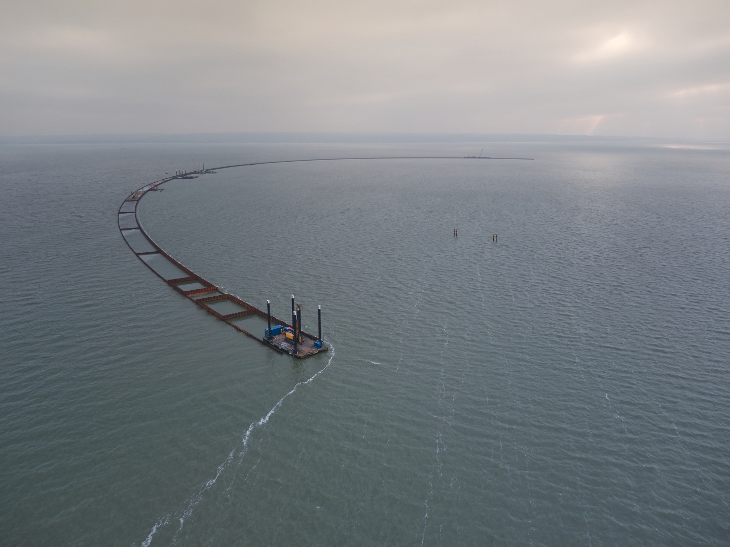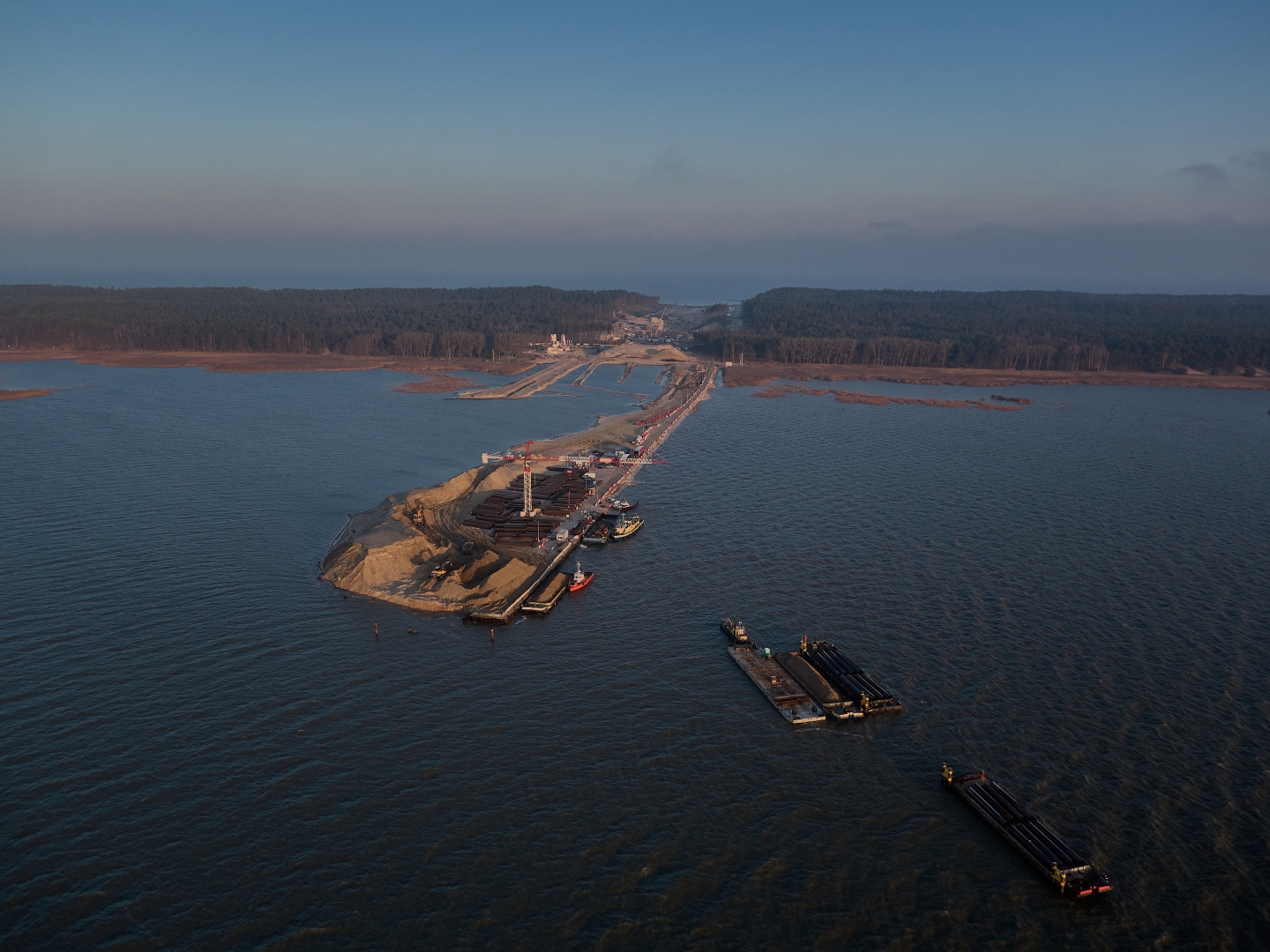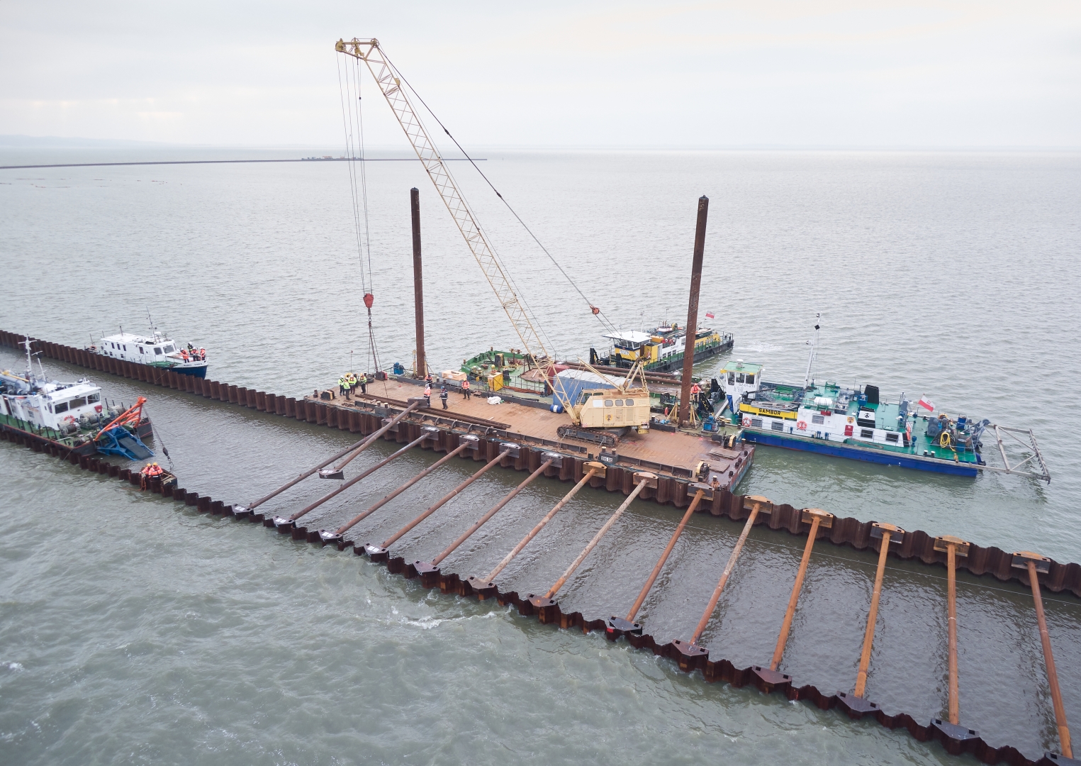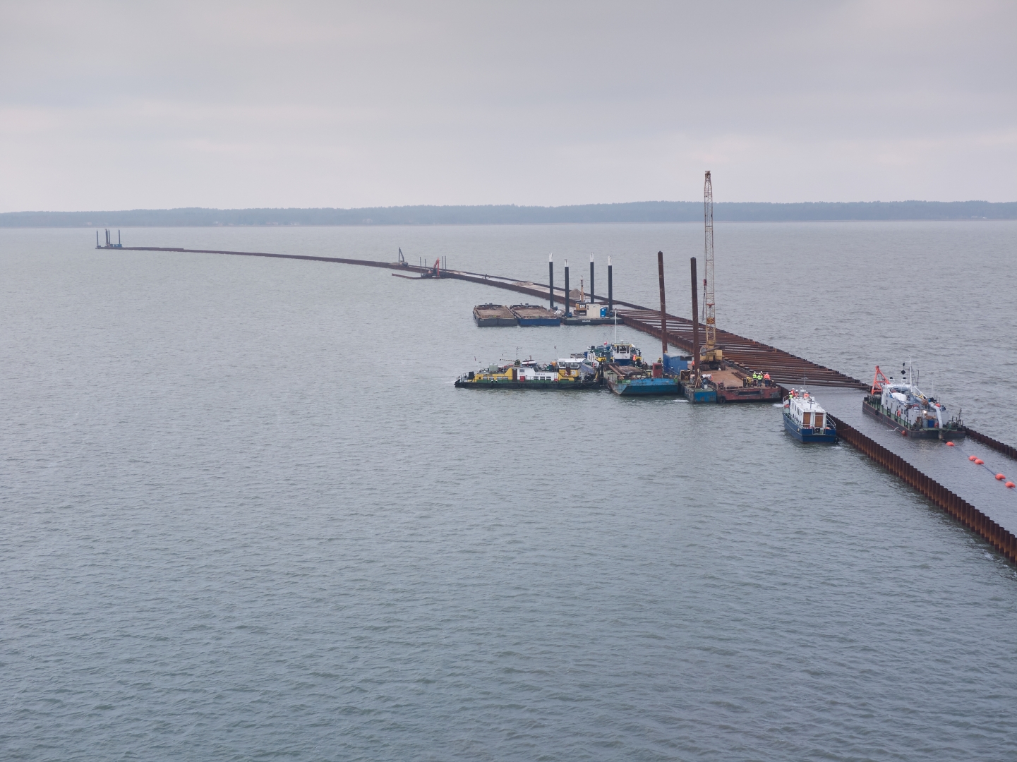 Na Zalewie Wiślanym wykonywana jest sztuczna wyspa. Trwa pogrążanie ścianek szczelnych, tworzących jej obwiednię. Wykonanych zostało już ponad 40 % prac. Montowane są ściągi i stopniowo zasypywana jest grodza.