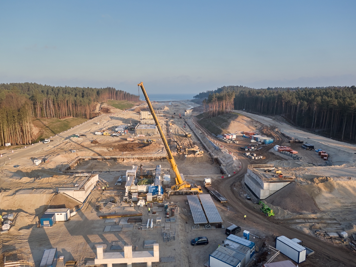 Na budowie kanału żeglugowego przez Mierzeję Wiślaną scalany jest pierwszy z dwóch mostów obrotowych. Konstrukcja będzie ważyła 500 ton, jej montaż odbywa się z dokładnością do milimetrów z wyważeniem konstrukcji do kilograma. Nie tylko mosty, prace przy budowie drogi wodnej łączącej Zalew Wiślany z Zatoką Gdańską toczą się intensywnie na całym obszarze.