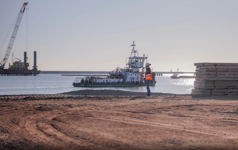 Aktualnie prowadzone są zasypy pod montaż kotew klapowych przy użyciu między innymi pogłębiarki Vox Apolonia, jednej z największych jednostek zasilanych LNG. Prace wykonywane są metodą rainbowing – mieszanina piasku i wody wyrzucana jest dyszami z dziobu statku i tworzy podwodny nasyp, który pozwala przygotować dno do dalszych działań. Jednocześnie trwa montaż kotew z pontonów – wszystko po to, by zapewnić odpowiednią współpracę ściany nabrzeża przy kolejnych etapach zasypów i robót żelbetowych.