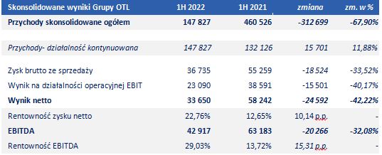 Przychody Grupy OTL w I półroczu 2022 r. wyniosły 147,83 mln zł, a zysk netto 33,65 mln zł wobec odpowiednio: 460,53 mln zł i 58,24 mln zł r/r . Zmniejszenie przychodów i zysku wynikało głównie ze sprzedaży i wyłączenia z konsolidacji w 2022 r. wyników spółek Grupy C. Hartwig Gdynia- skonsolidowane przychody z działalności kontynuowanej były wyższe w I półroczu 2022 r. o 11,88% r/r. O 17,3% wzrosły przychody z działalności portowej. Wolumenowo dotyczyło to towarów masowych w porcie w Świnoujściu (+12% r/r) oraz drobnicowych w porcie w Gdyni (+7%). Grupa OTL wypracowała 42,92 mln zł EBITDA wobec 63,18 mln zł r/r, przy czym EBITDA w I półroczu 2022 r. była wyższa o 7,6 mln zł na działalności kontynuowanej od skorygowanej o efekty zdarzeń jednorazowych EBITDA pierwszego półrocza 2021 roku.