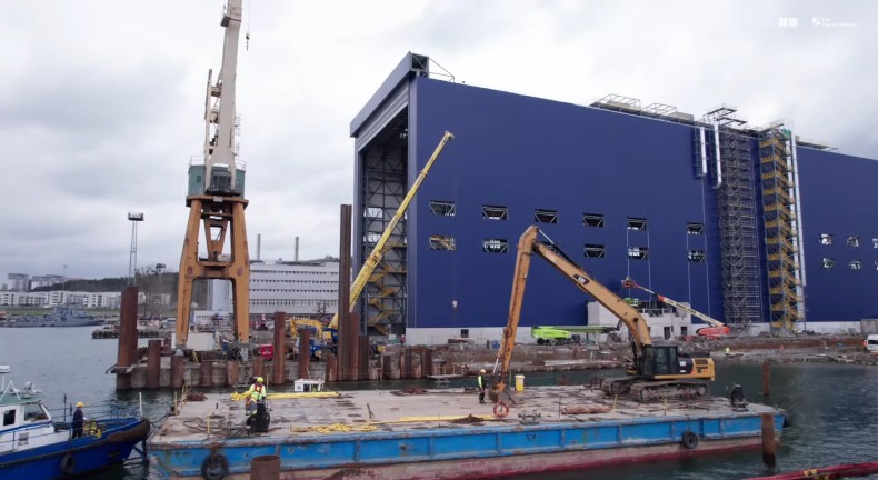 Trwają intensywne prace budowlane przy największym obiekcie w gdyńskiej stoczni. Obiekt, w którym będą montowane kadłuby wielozadaniowych fregat programu "Miecznik" nabiera oczekiwanego wyglądu tak od zewnątrz, jak i od wewnątrz. Pojawia się w nim także kluczowe wyposażenie przeznaczone do prac stoczniowych.