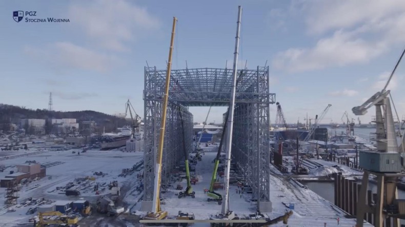 Trwa rozpoczęta w ubiegłym roku największa inwestycja budowlana w gdyńskiej stoczni. Dzięki niej powstaje najwyższa hala tego rodzaju w Polsce. To w niej będą montowane elementy kadłubów wielozadaniowych fregat programu "Miecznik".