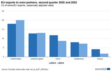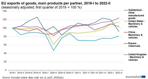 Eksport maszyn i pojazdów z UE do trzech z pięciu głównych partnerów handlowych stanowił dominującą kategorię eksportowanych towarów, z wyjątkiem Szwajcarii i Rosji. Między I kwartałem 2019 r. a II kwartałem 2022 r. o 14% wrósł eksport do Stanów Zjednoczonych, a o 3% do Chin. Natomiast spadł o 19% eksport tej kategorii produktów przemysłowych do Wielkiej Brytanii. Do Rosji głównym towarem eksportowanym były chemikalia. Jednak eksport spadł o 8%.